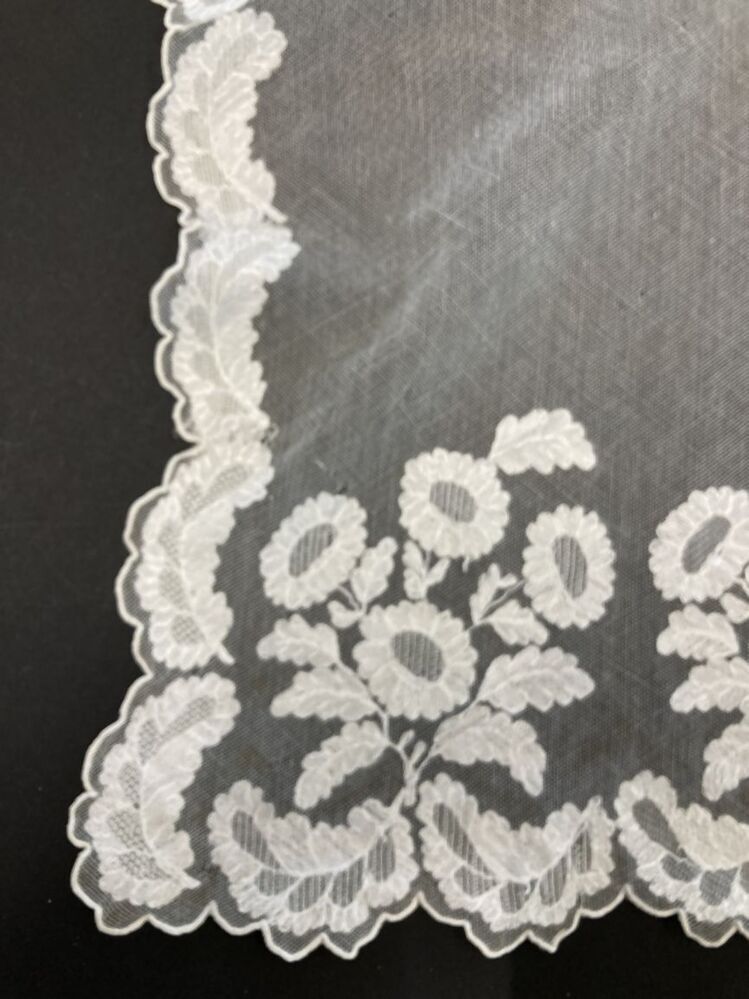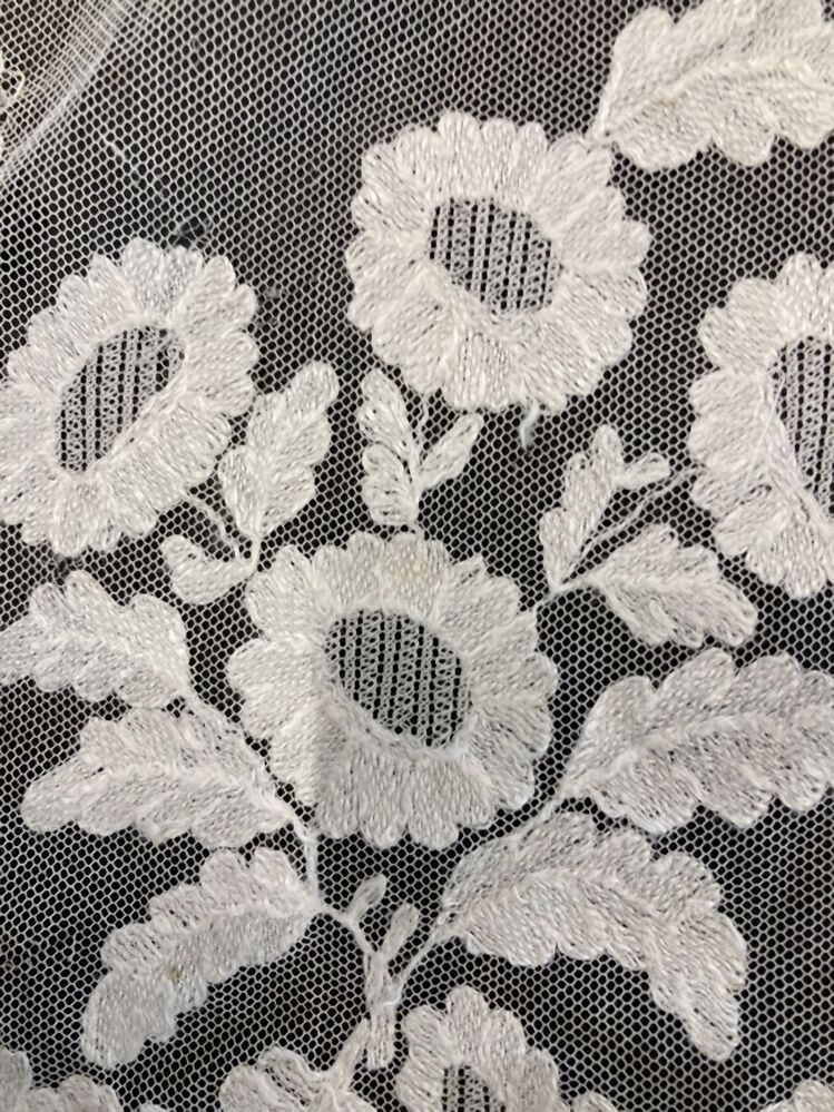 Schort van tule waarop met bladmotief doorgestopte randen, boeketjes langs de zoom, gebruikt als doopsluier