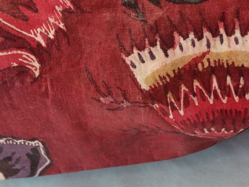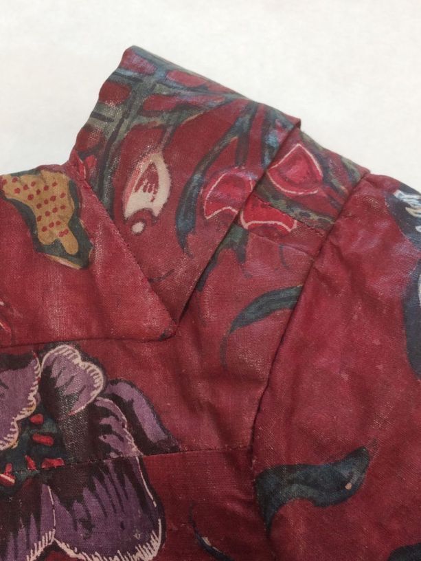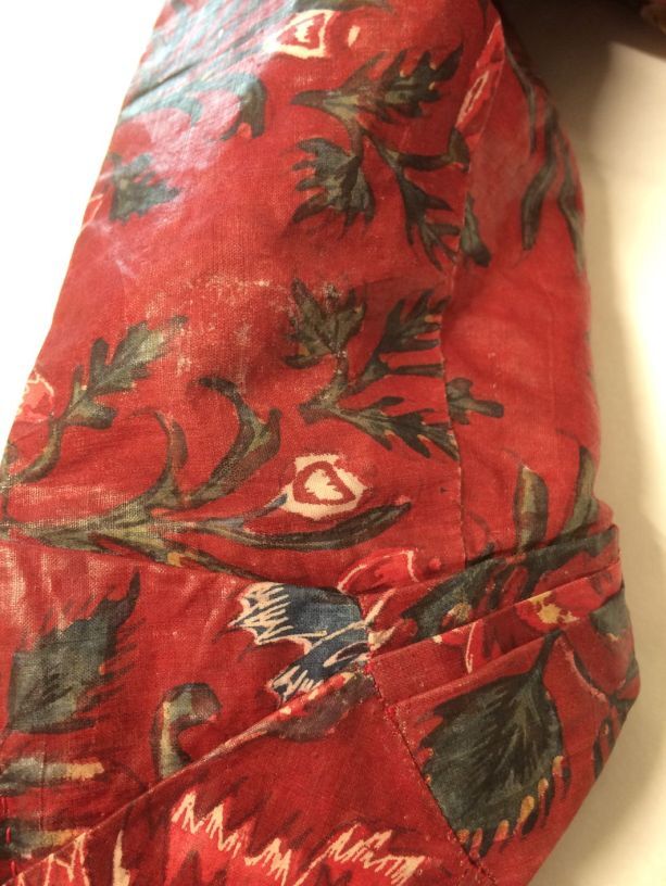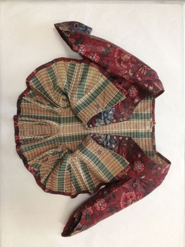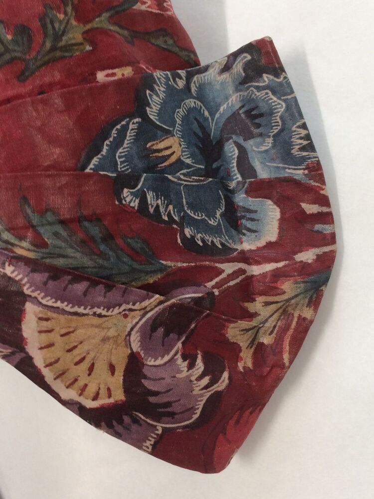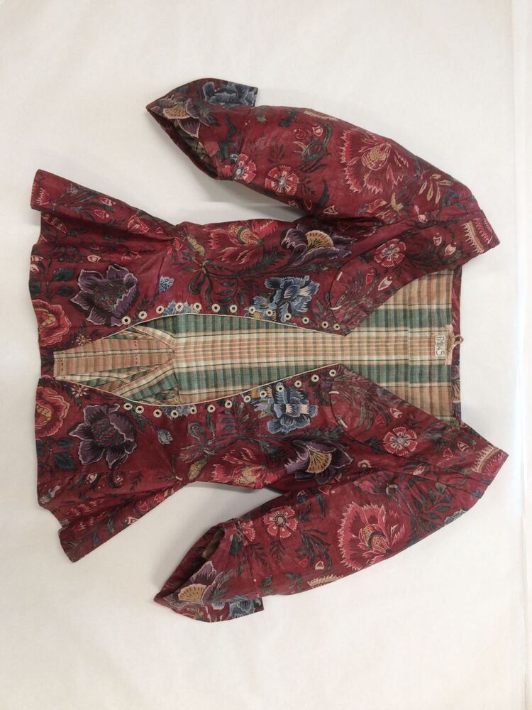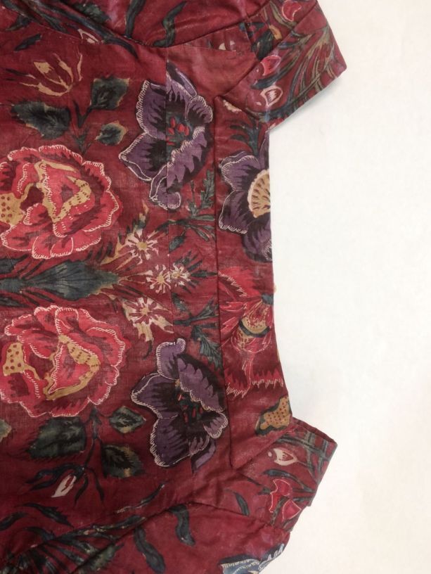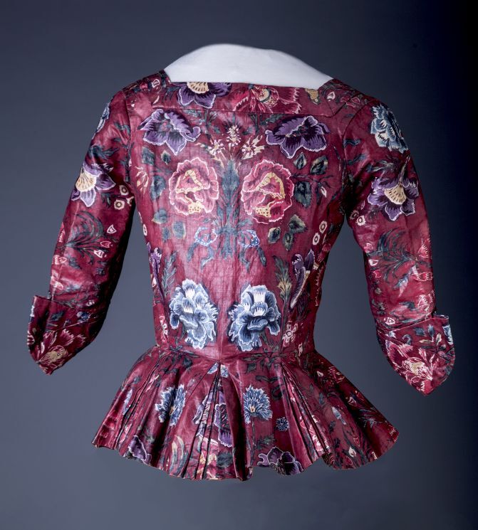 Sitsen vrouwenjak gedragen in Noord-Holland 'door deftige vrouwen', symmetrisch patroon van gestrikte boeketten van veelsoortige grote en kleine bloemen op glanzend rode grond.