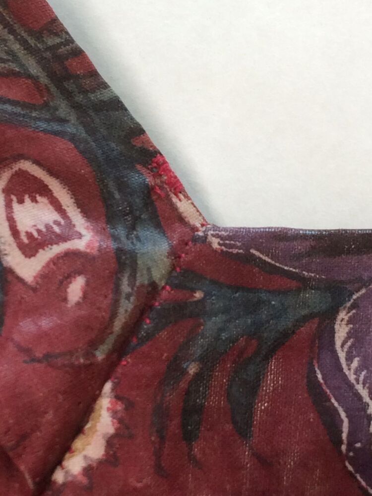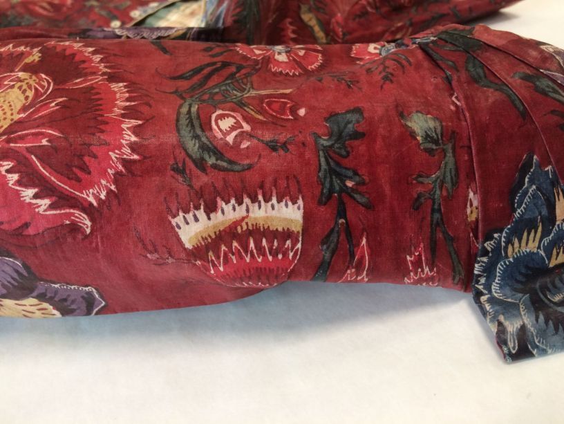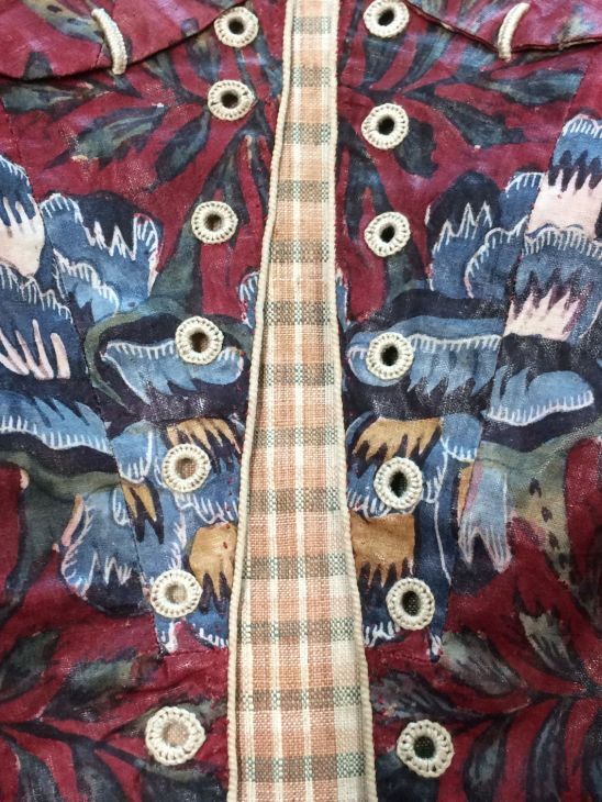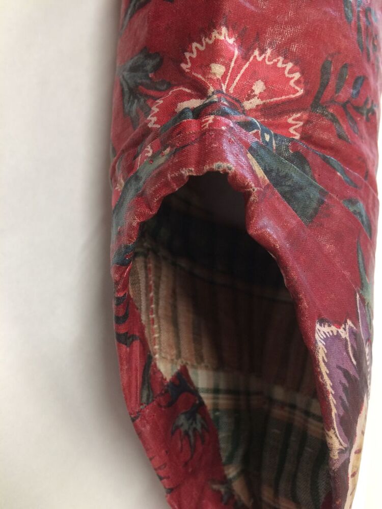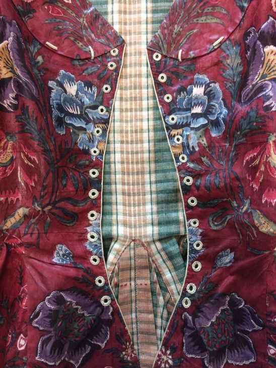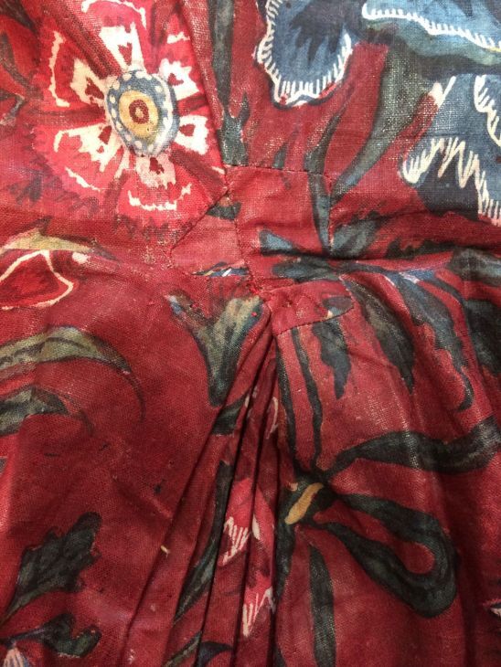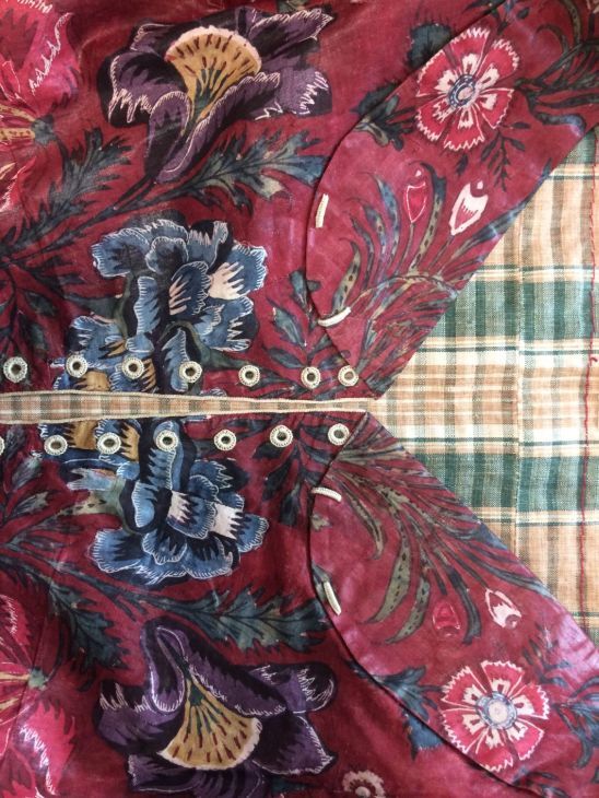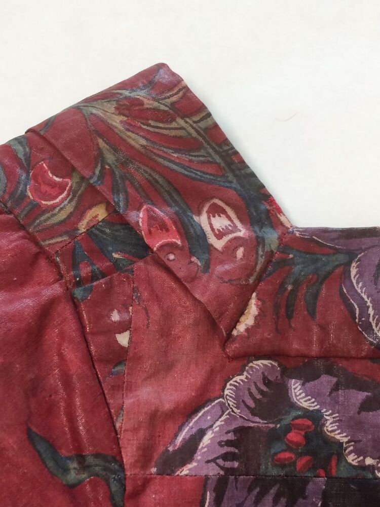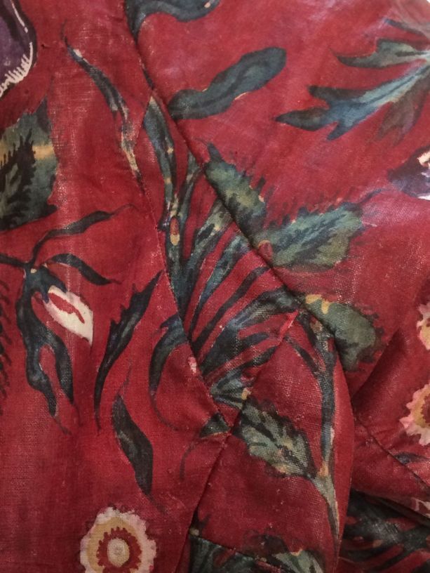 Sitsen vrouwenjak gedragen in Noord-Holland 'door deftige vrouwen', symmetrisch patroon van gestrikte boeketten van veelsoortige grote en kleine bloemen op glanzend rode grond.