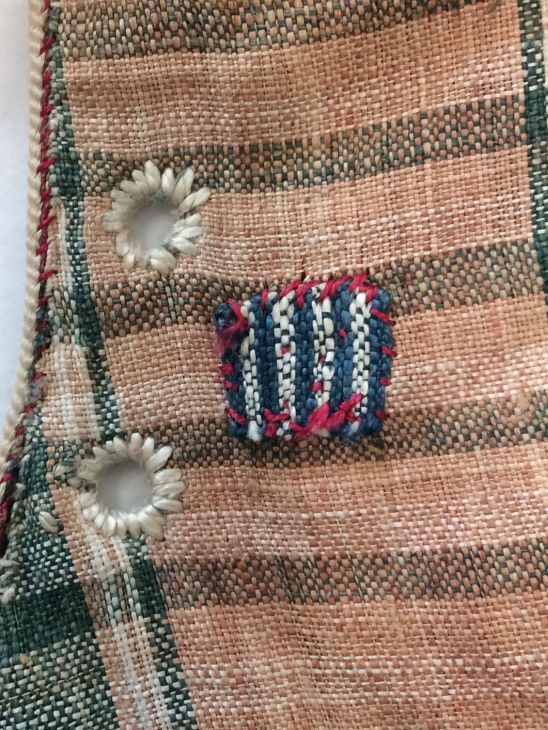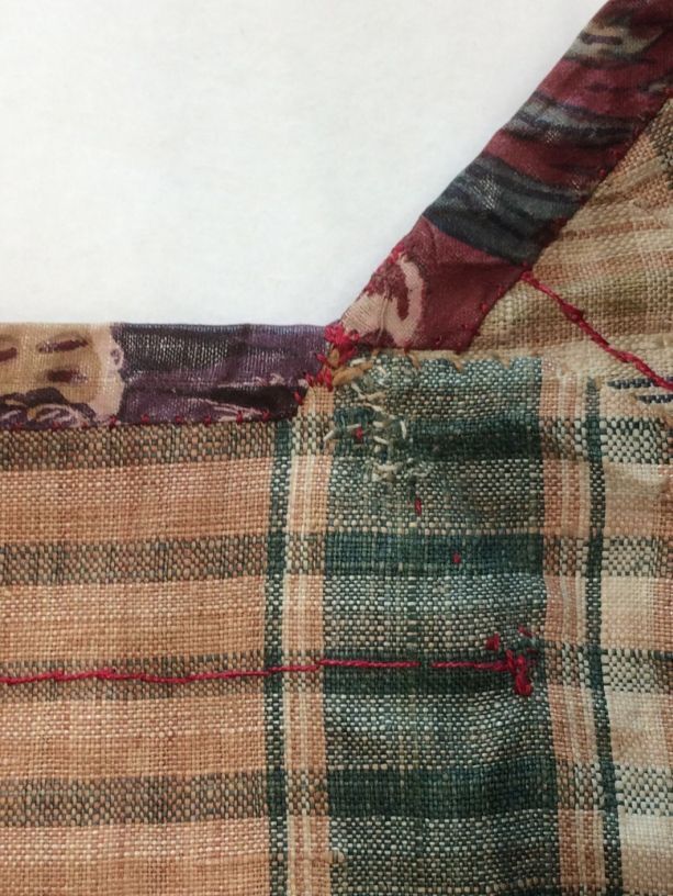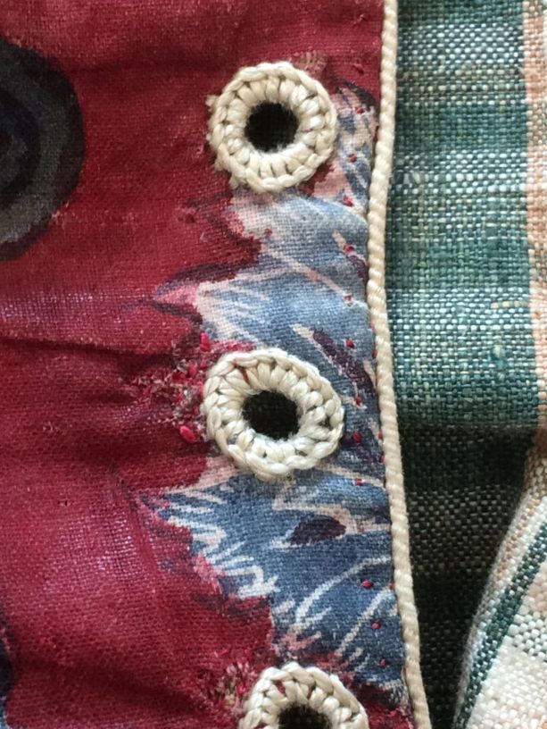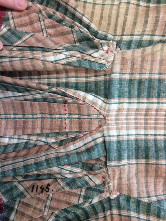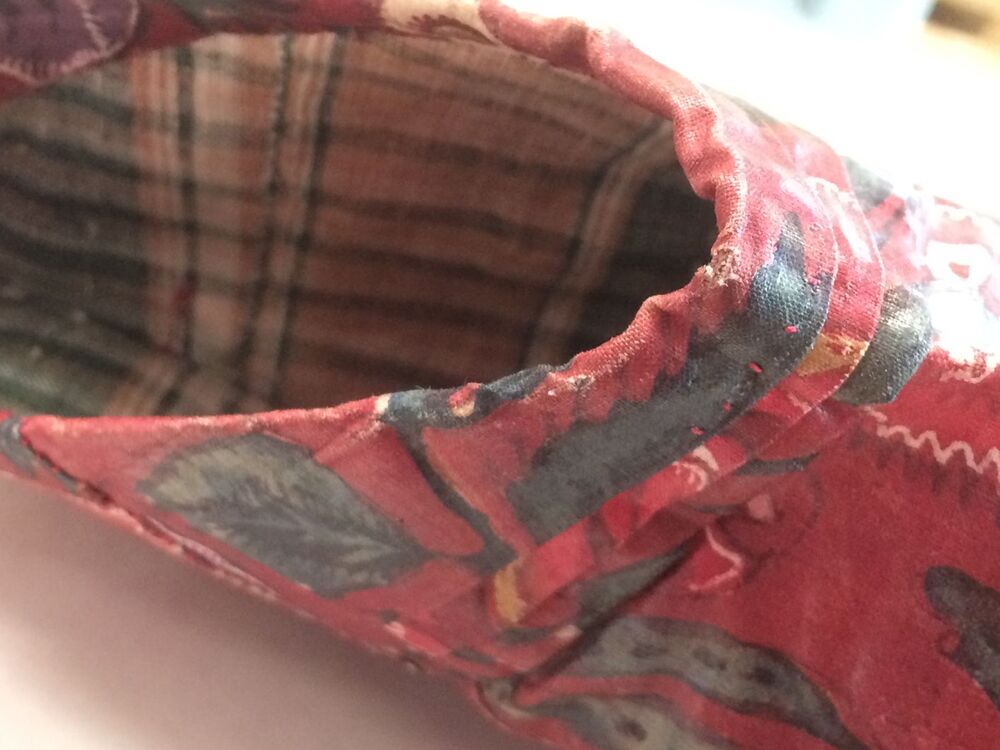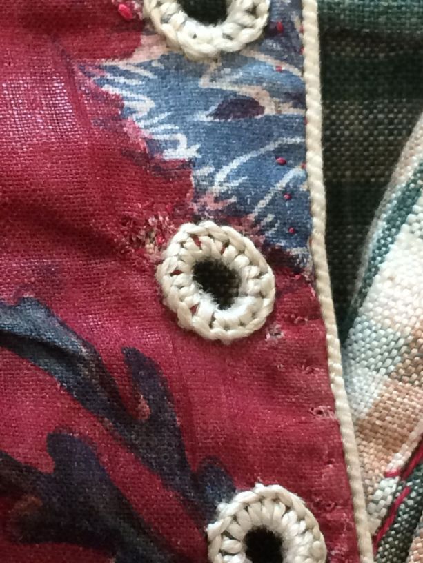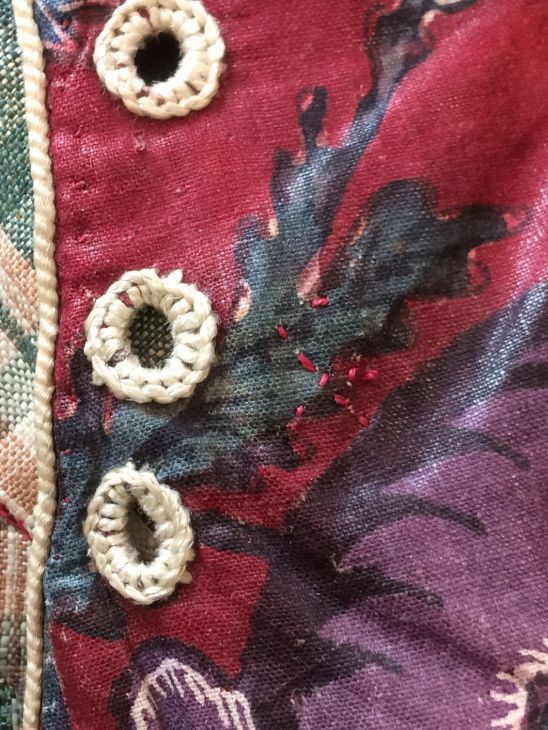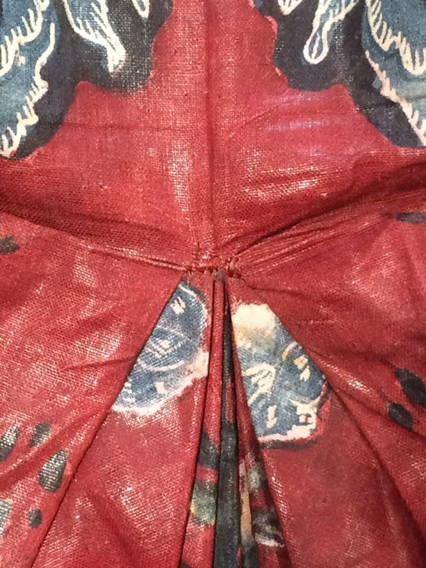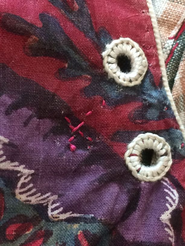 Sitsen vrouwenjak gedragen in Noord-Holland 'door deftige vrouwen', symmetrisch patroon van gestrikte boeketten van veelsoortige grote en kleine bloemen op glanzend rode grond.