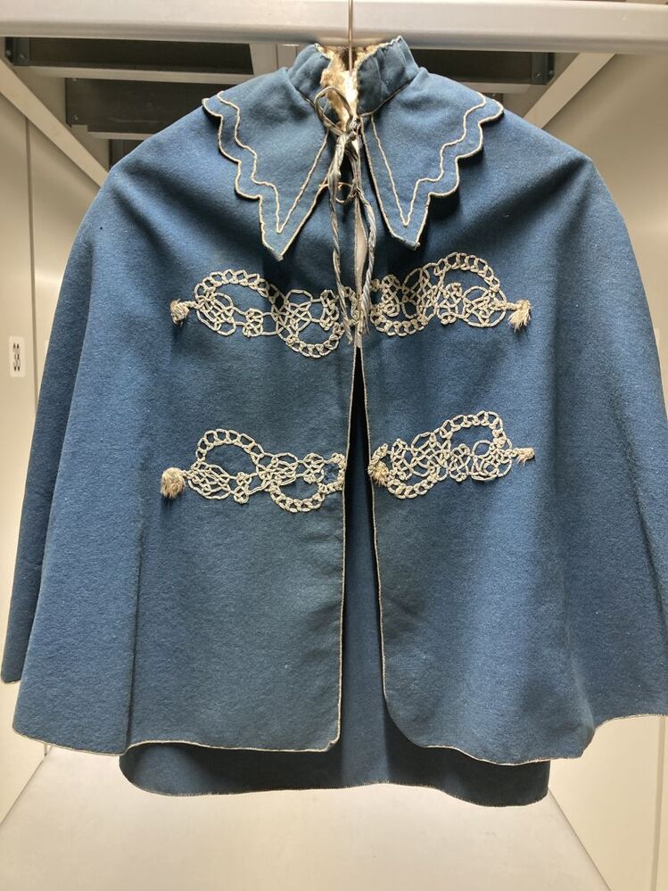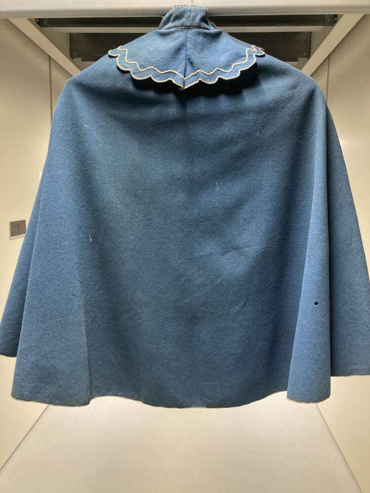 Schoudermantel van blauwe wol met platte geschulpte kraag, pluche boord met lichtblauw linnen tressen