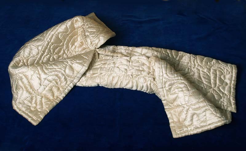 Pakdeken of doopmantel van crème zijden satijn met doorgestikt patroon, ingenaaide plooien en rugsluitingen van linnen band, onderdeel van groep van acht