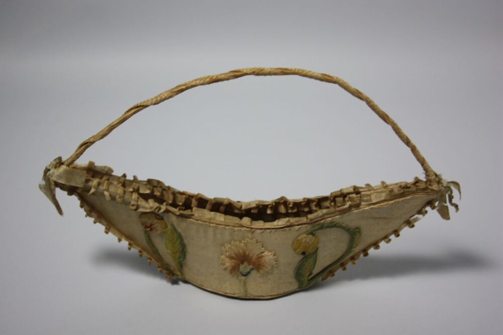 Een van twee schuitvormige tasjes met gebogen handvat van creme satijn met geborduurde bloemen, onderop een blauwe bloem