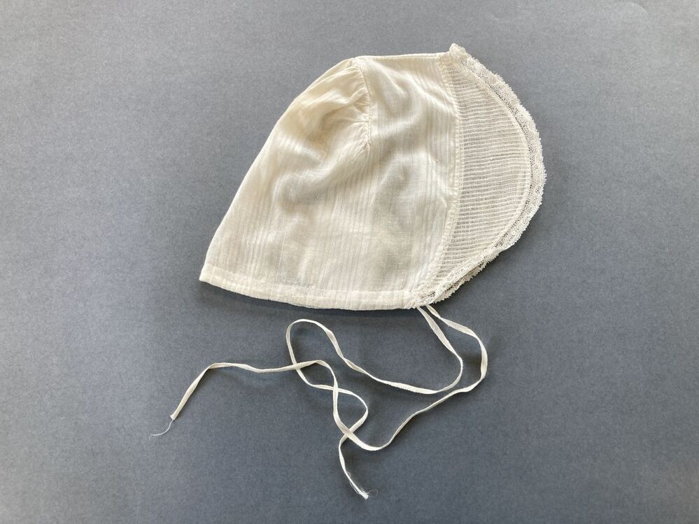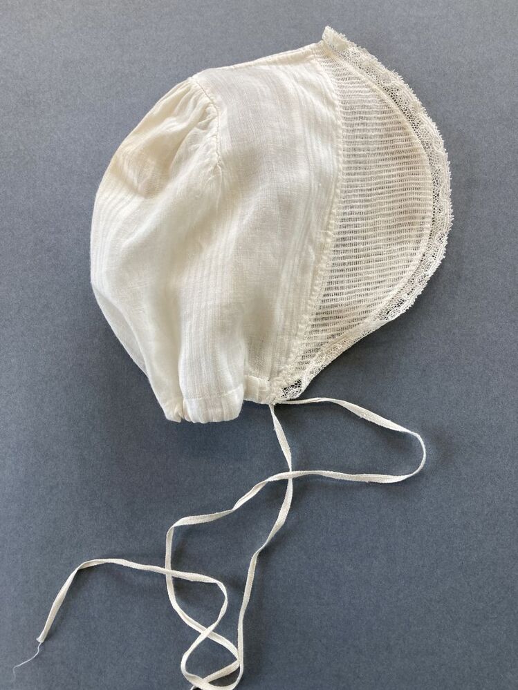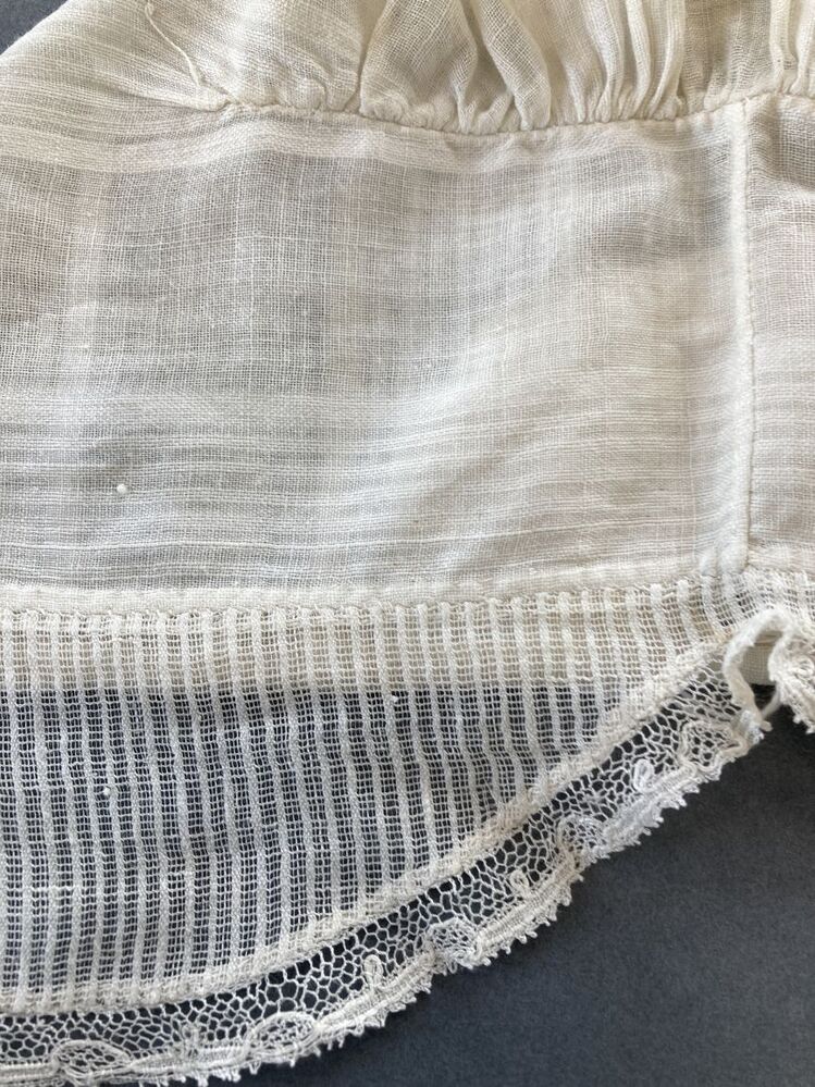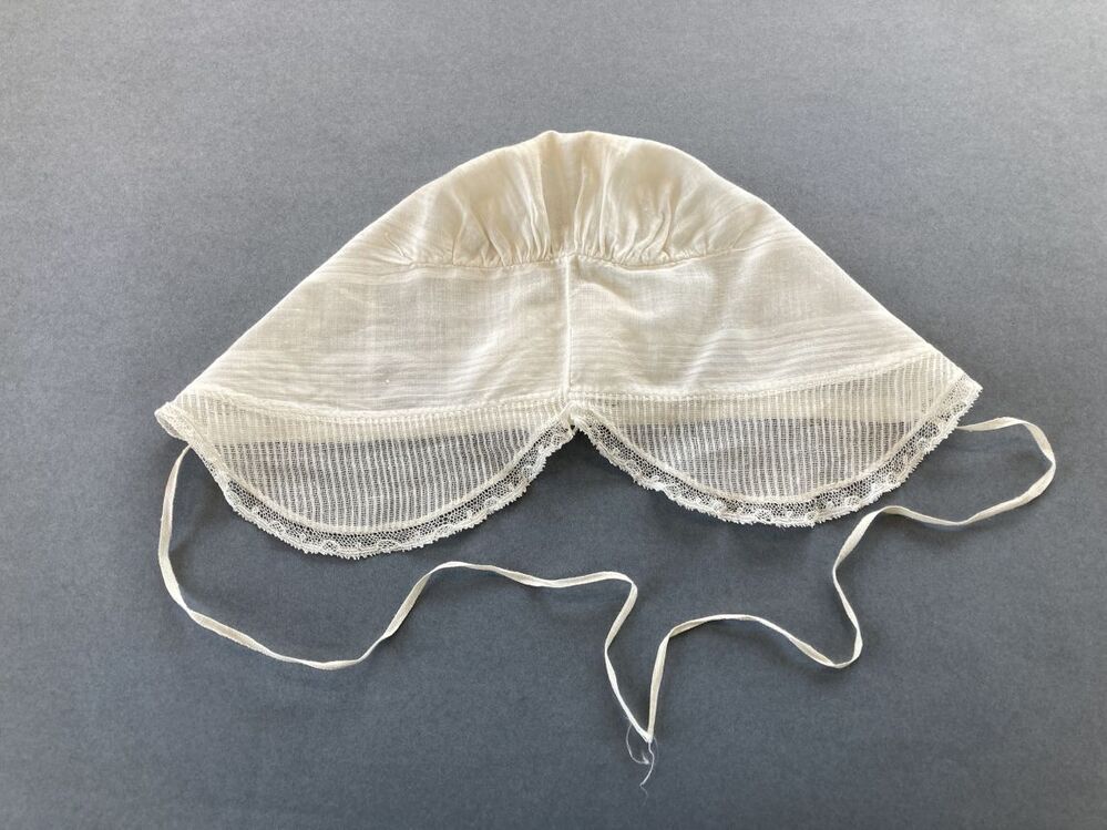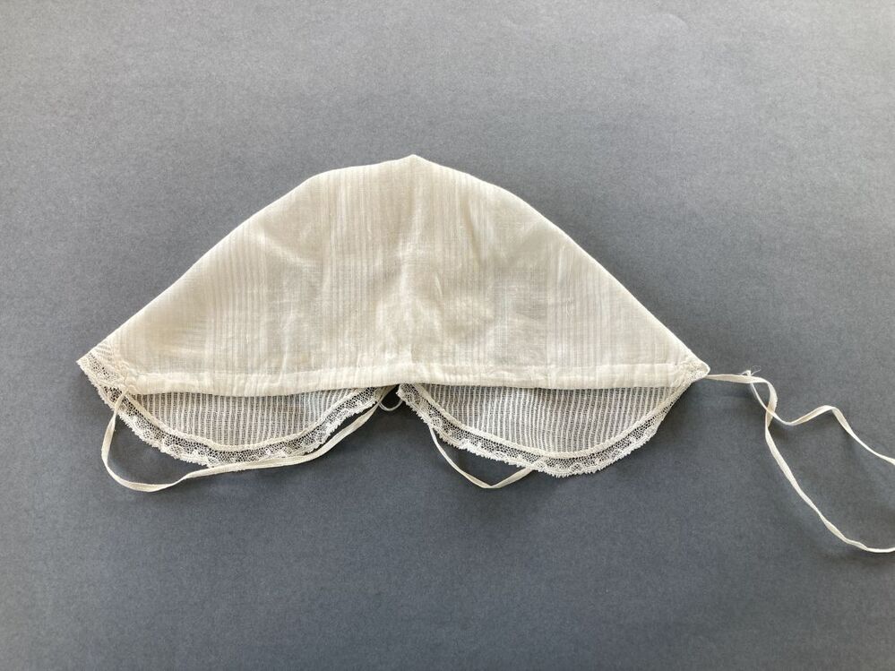 Cornetmutsje van witte gestreepte katoenen mousseline afgezet met Rijsselse kloskant