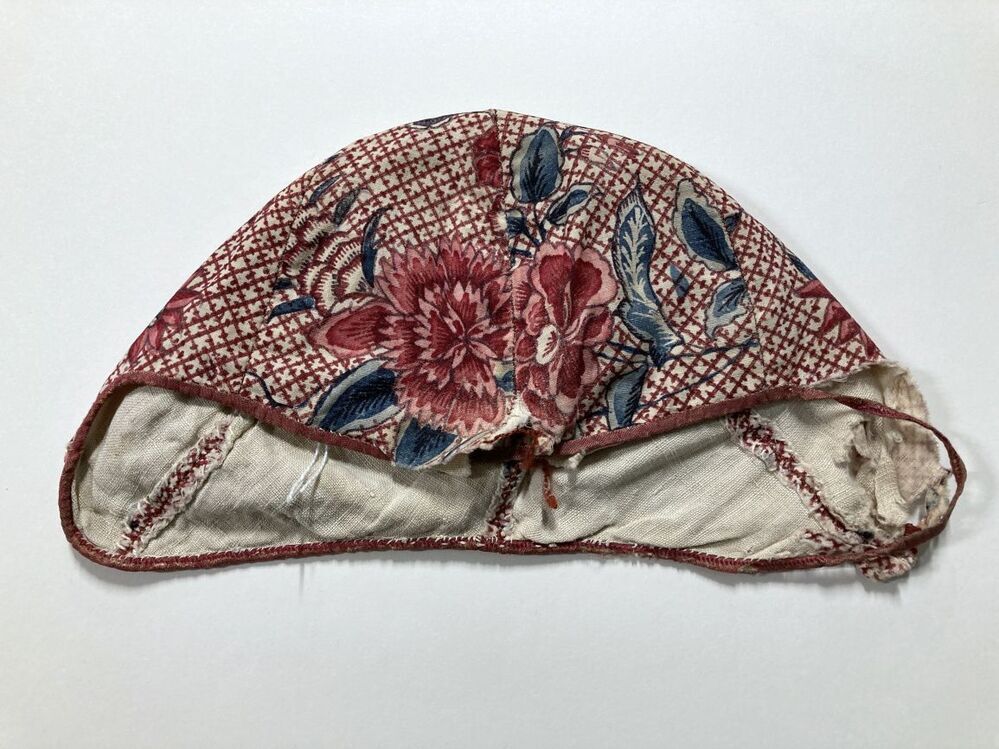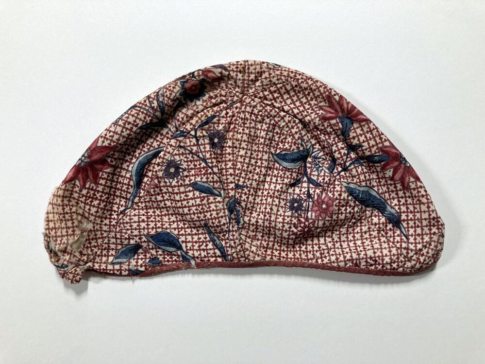 Sitsen jongensmuts, met bloemranken over een rood raster op witte grond