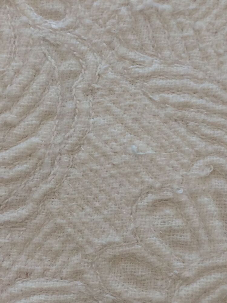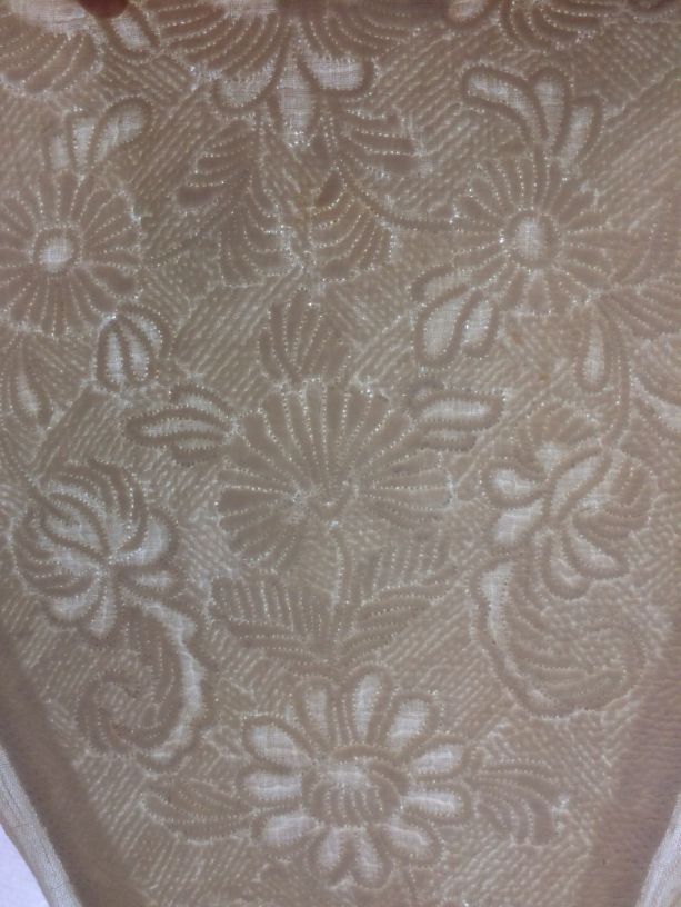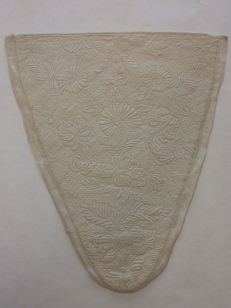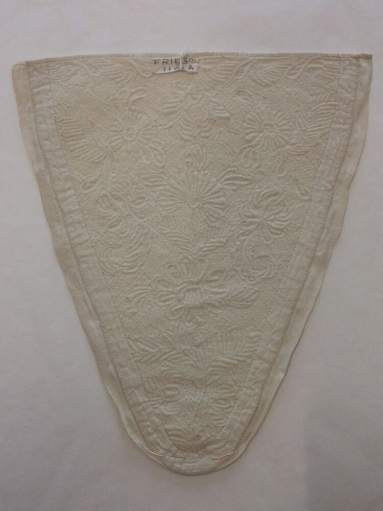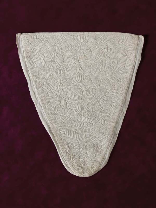 Driehoekige borstlap of stomacher van wit linnen met sierlijk bloemmotief in zaans stikwerk of marseilles