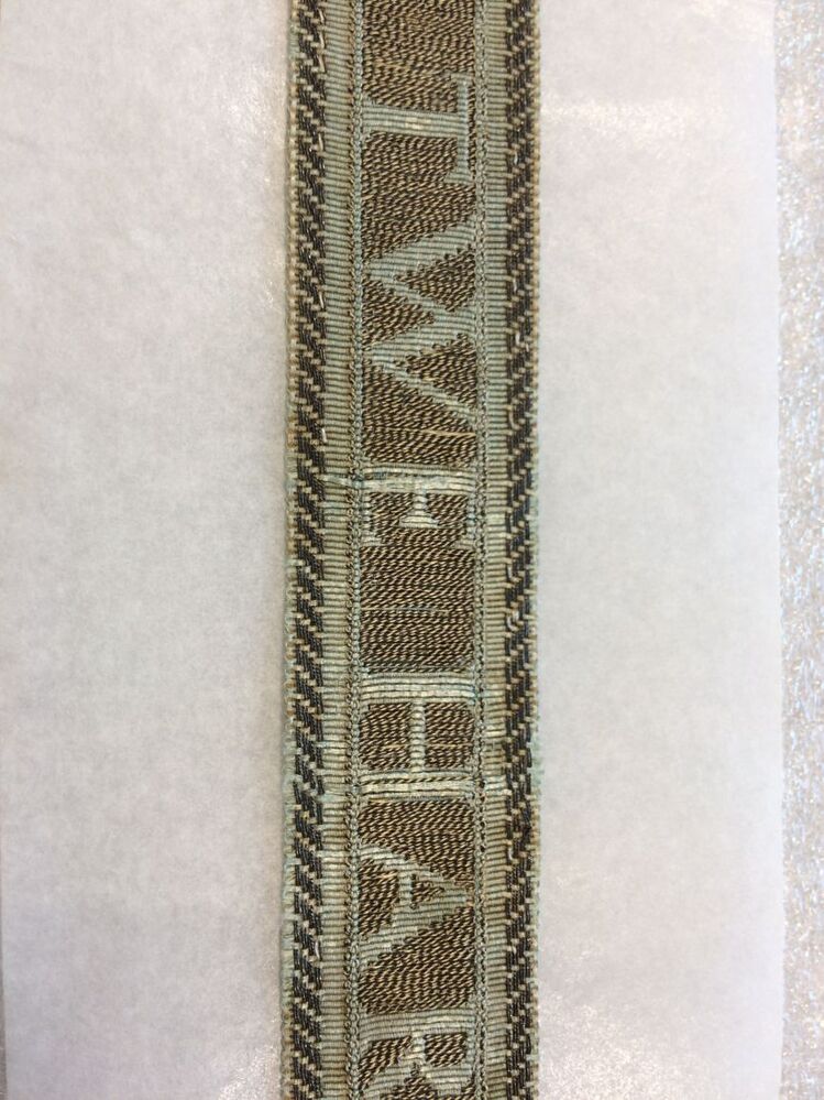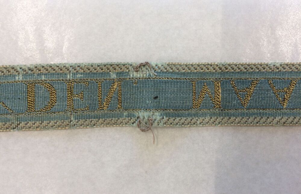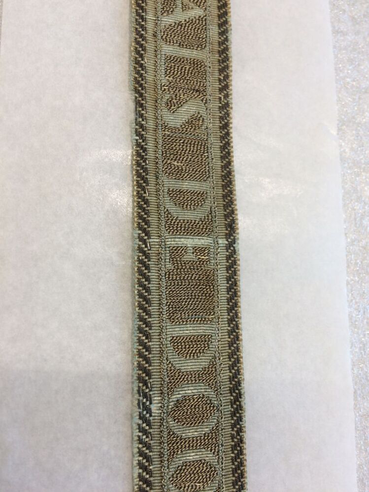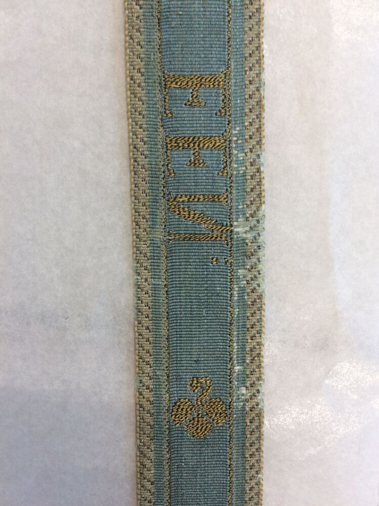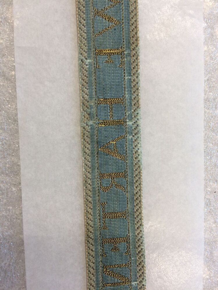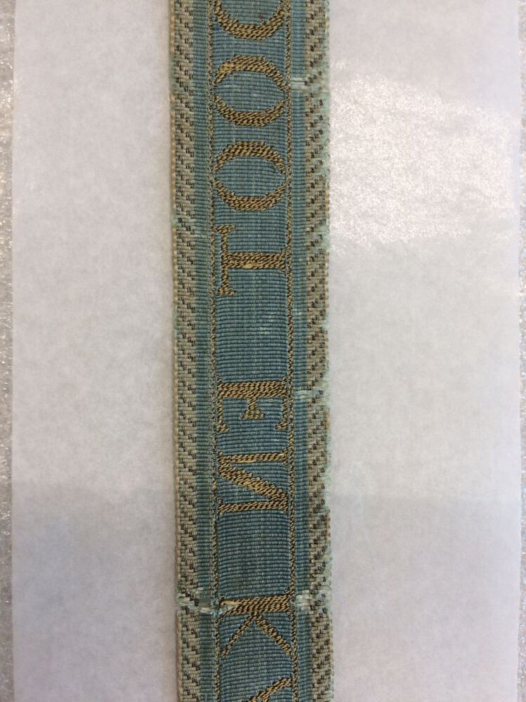 Huwelijkslint van blauwe zijde met goud en zilverdraad met ingeweven tekst