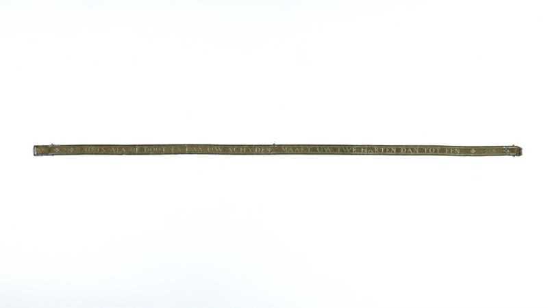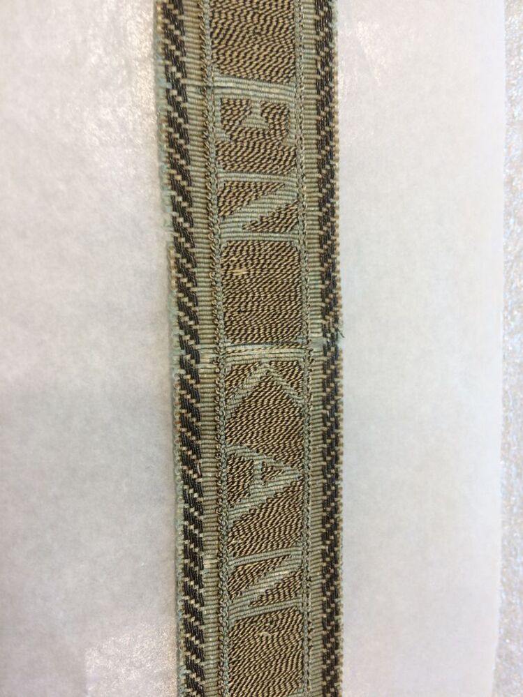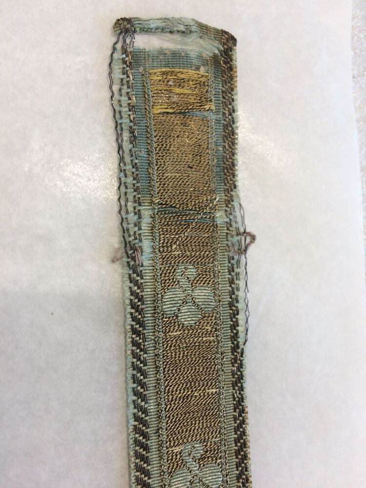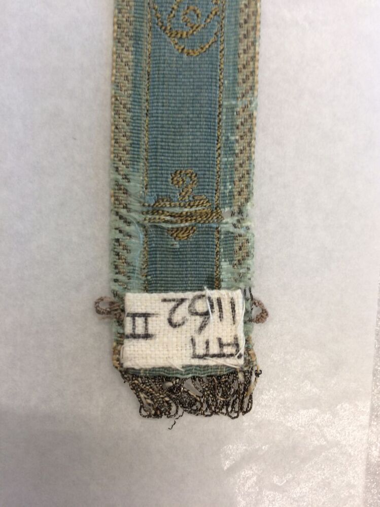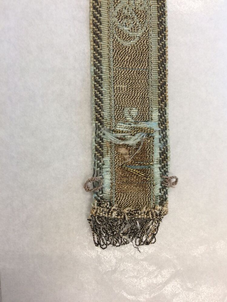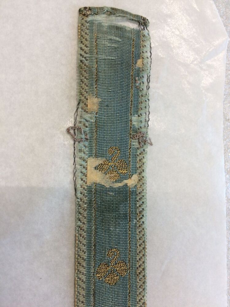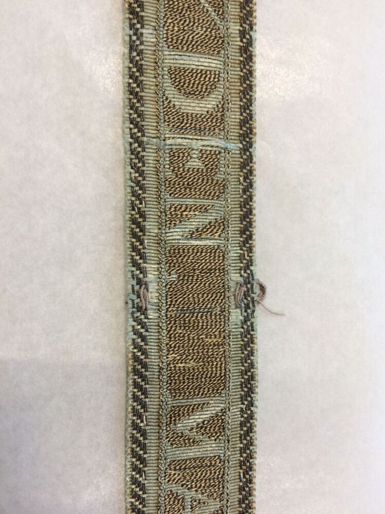 Huwelijkslint van blauwe zijde met goud en zilverdraad met ingeweven tekst