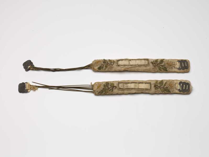 Kouseband, frans geborduurd met bloemen, elastieken en gespen, met tekst