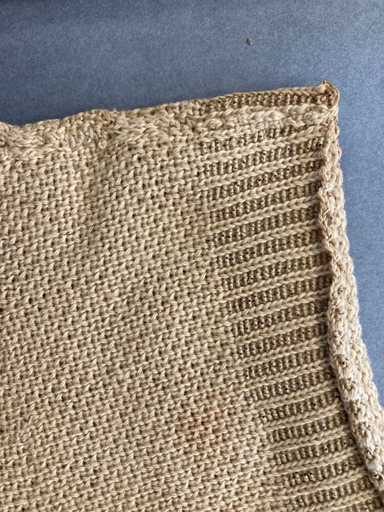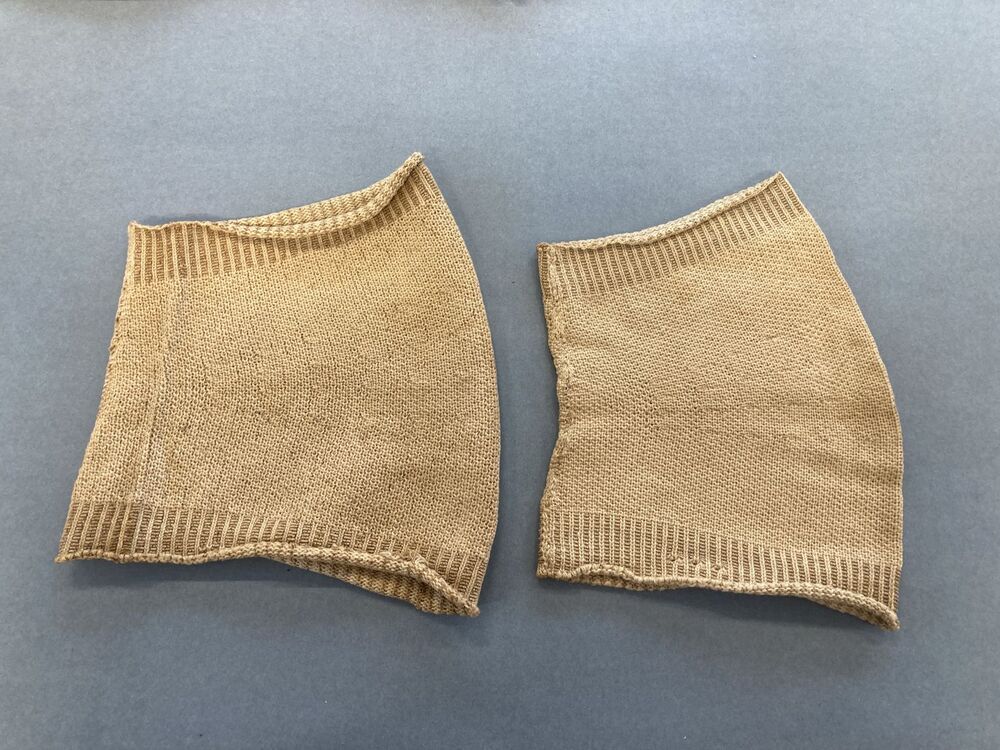 Elastieken kniestukken of kniekousen, gebreid van geel-beige katoen met elastiek