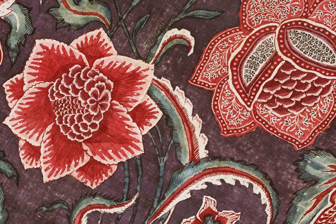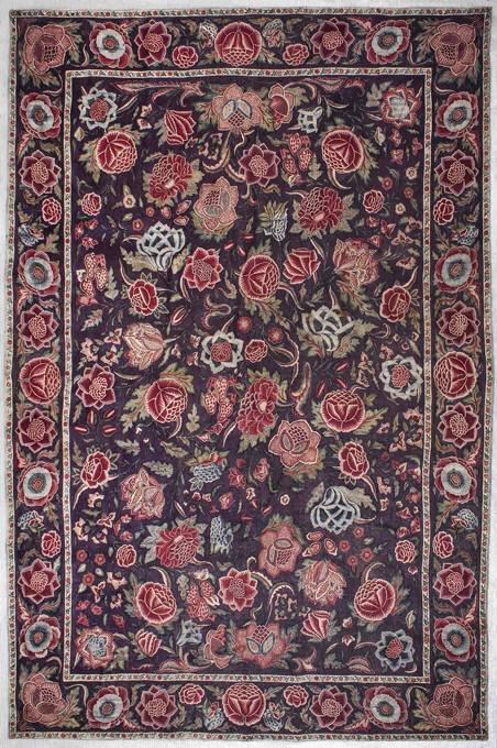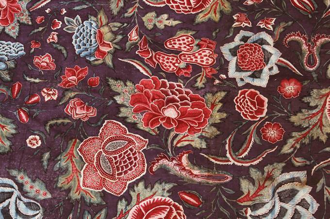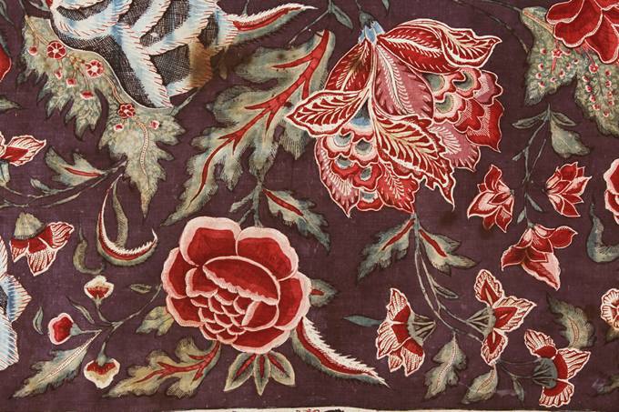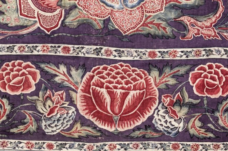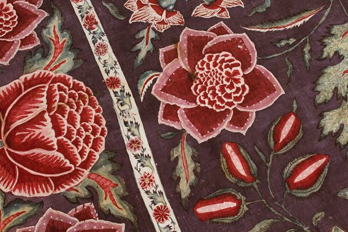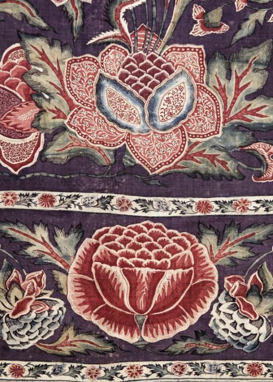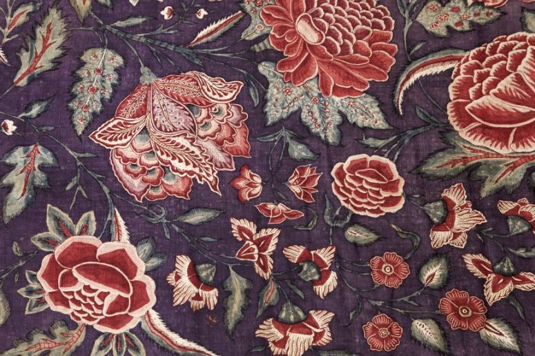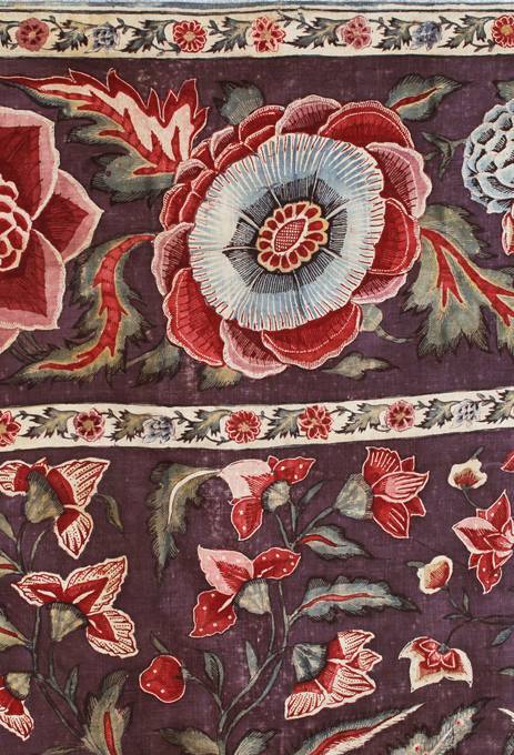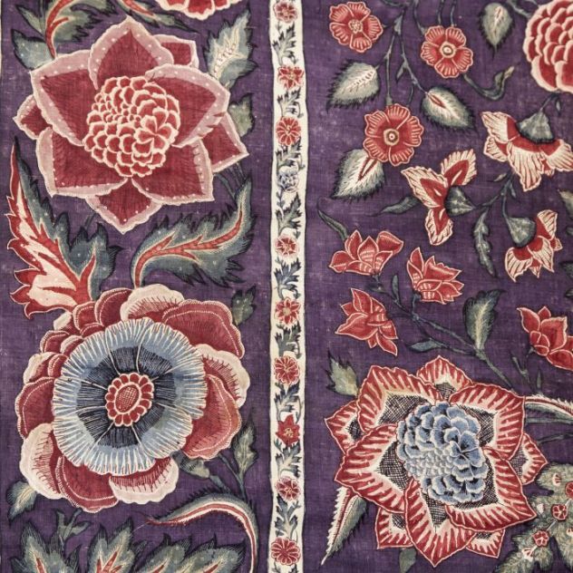 Sitsen palempore met grote bolle bloemmotieven op middenveld en in rand op paarse grond