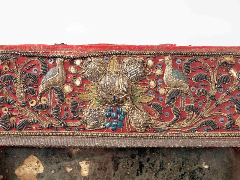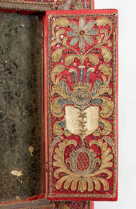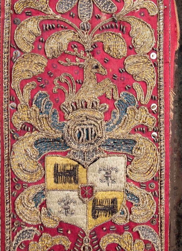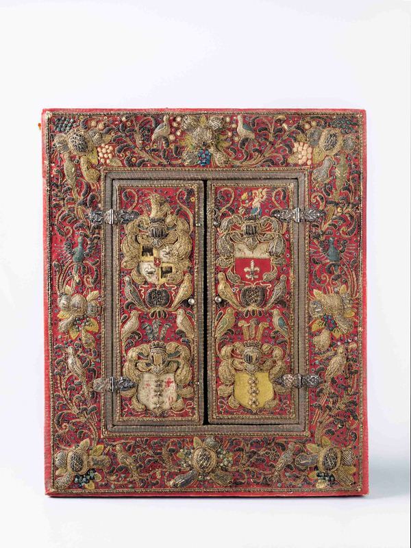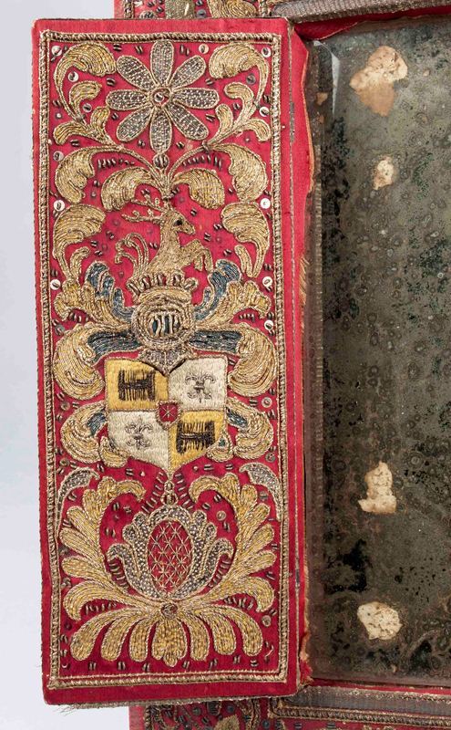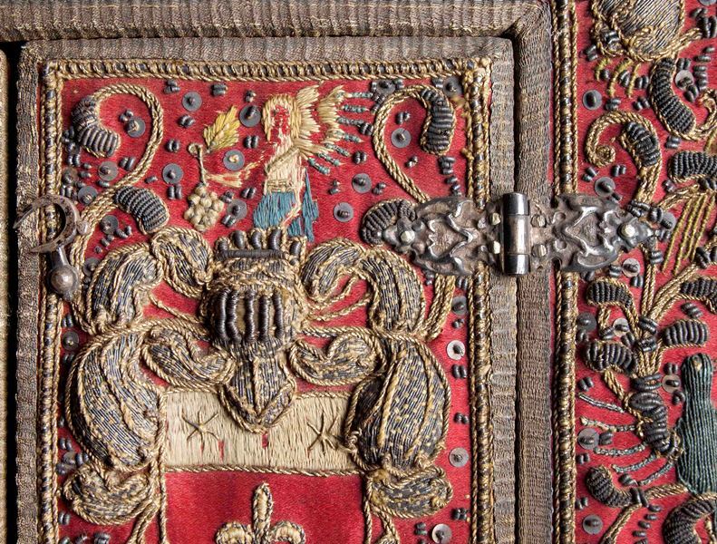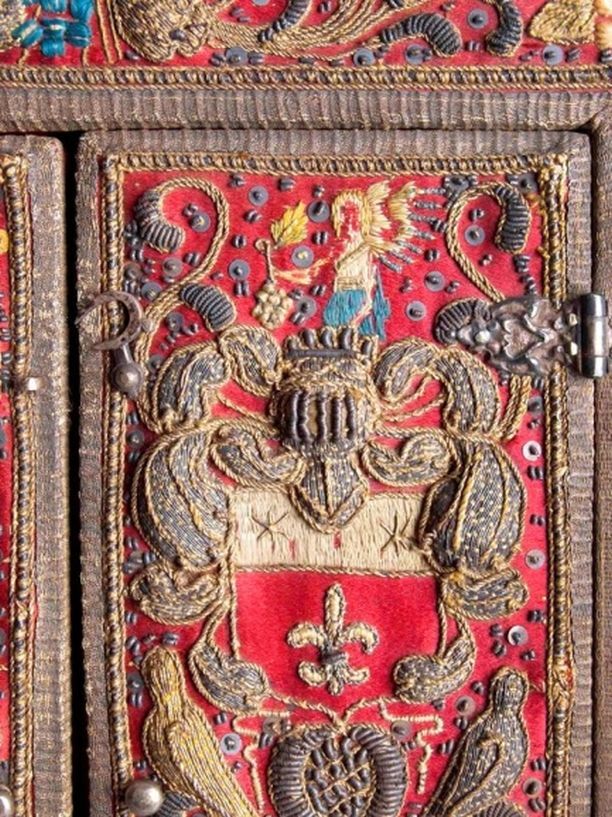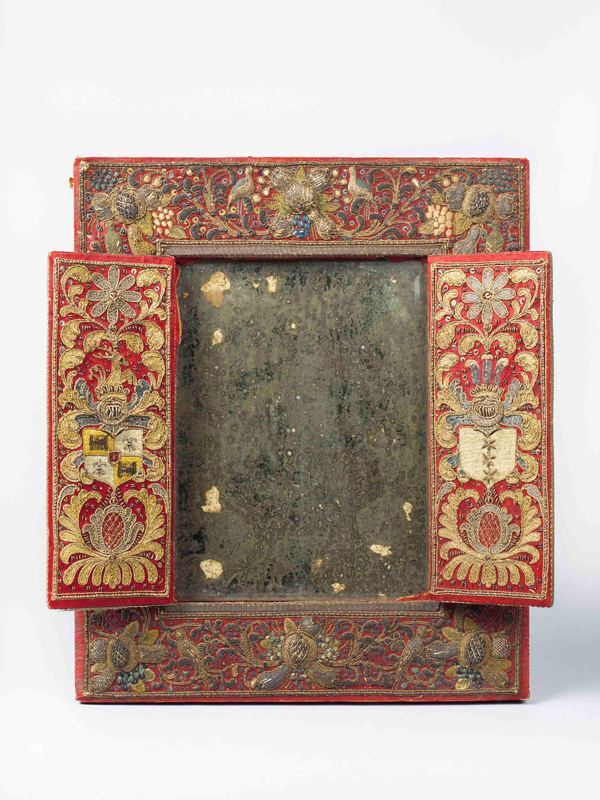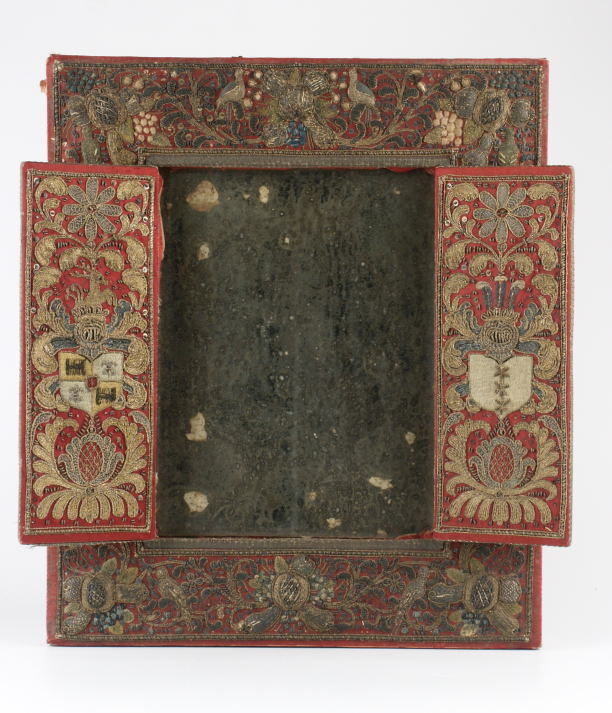 Spiegel met geborduurde lijst en deurtjes, huwelijksgeschenk voor Taeke van Cammingha en Luts van Grovestins, 1638