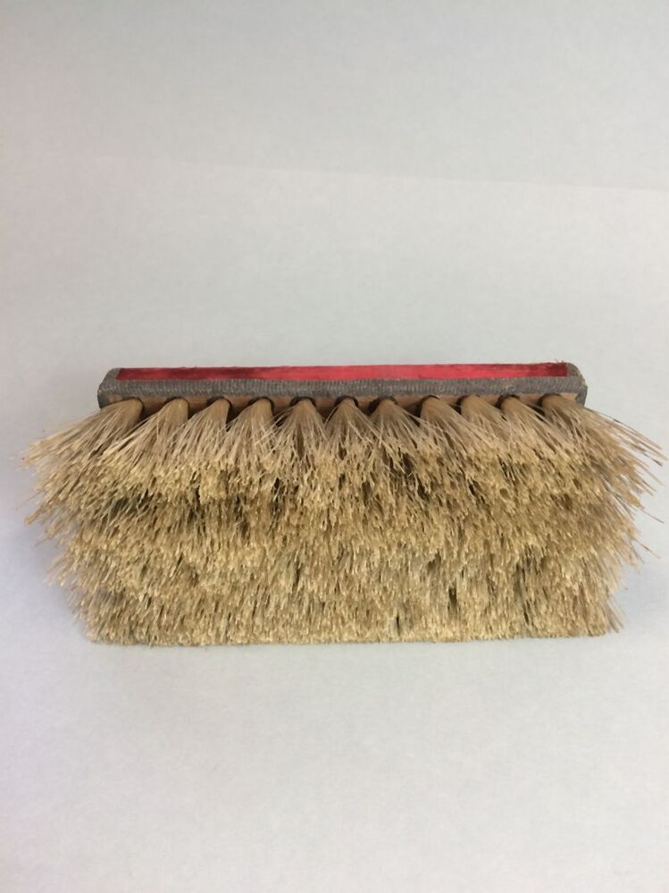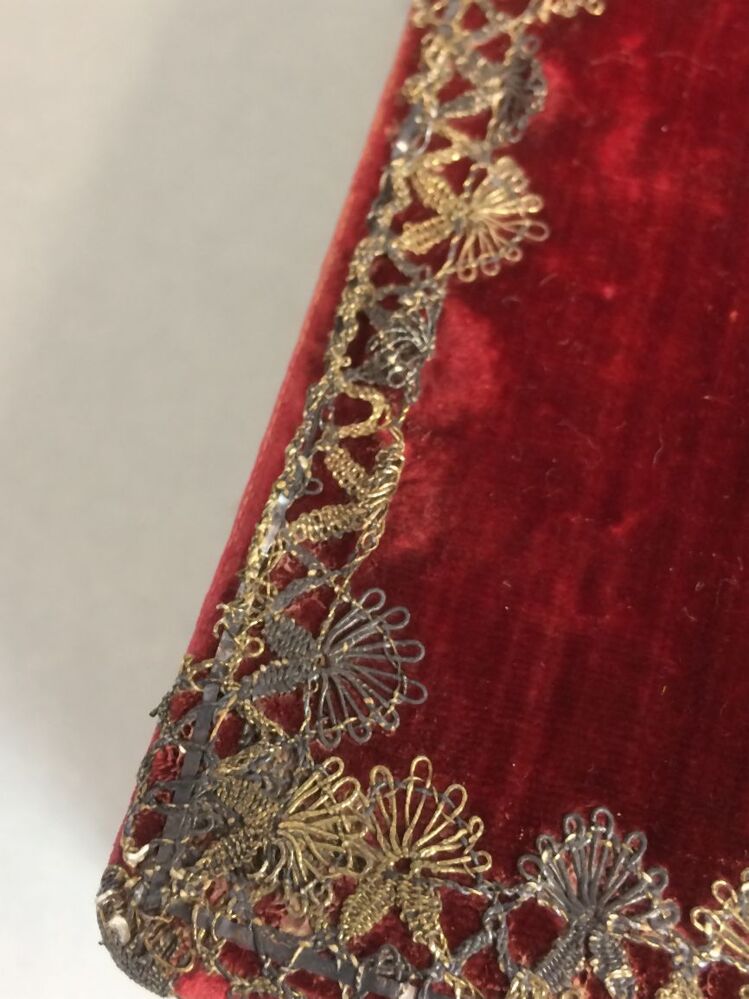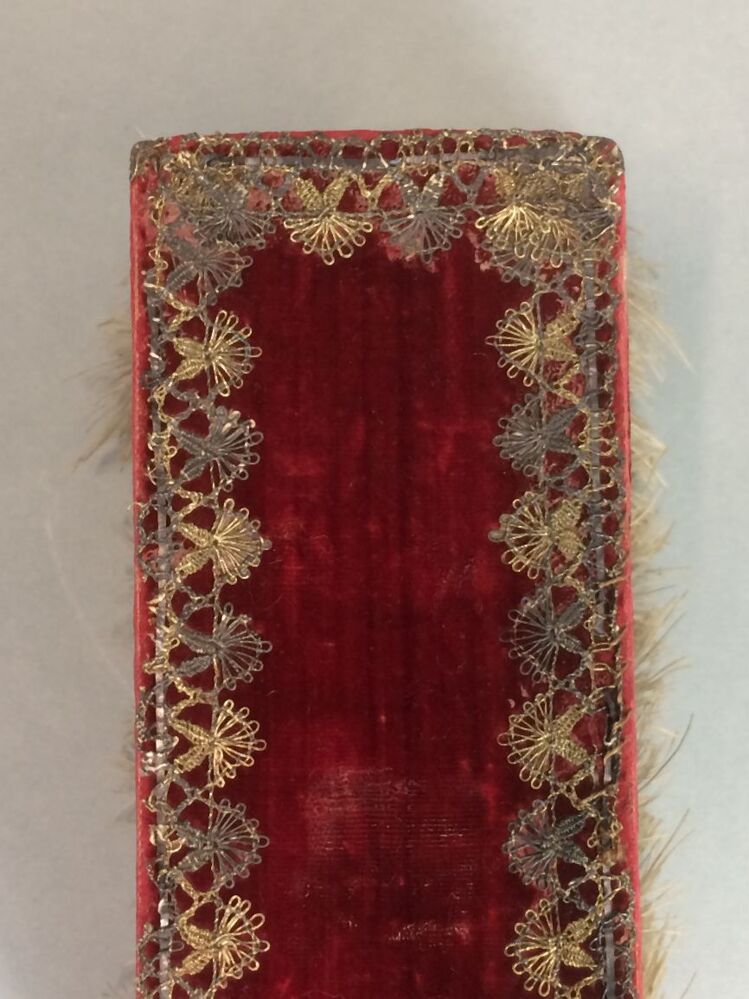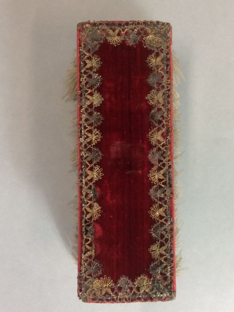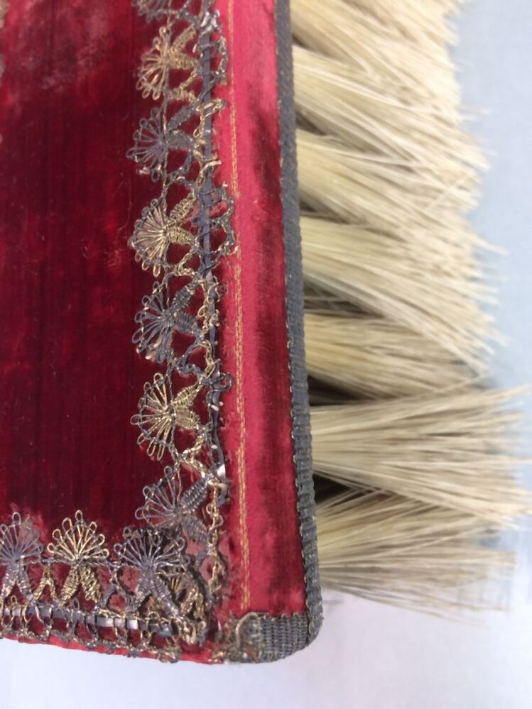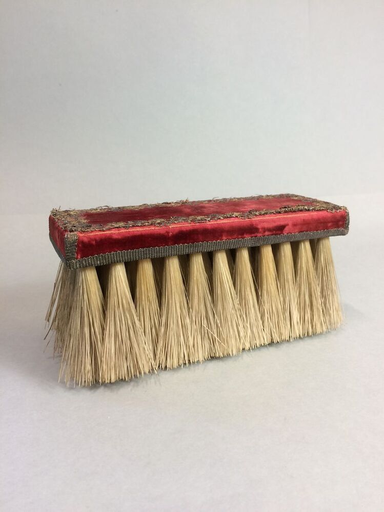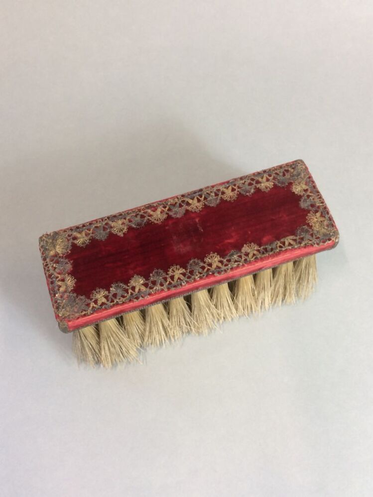 Rechthoekige kledingborstel, het handvat bekleed met rood zijdefluweel en versierd met kloskant in zilver- en gouddraad