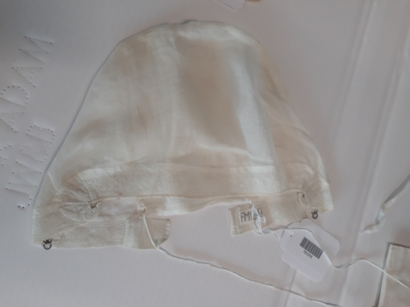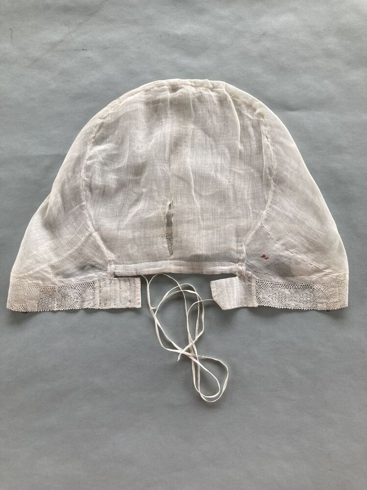 Trekmuts van fijn linnen batist afgezet met Hollandse kloskant