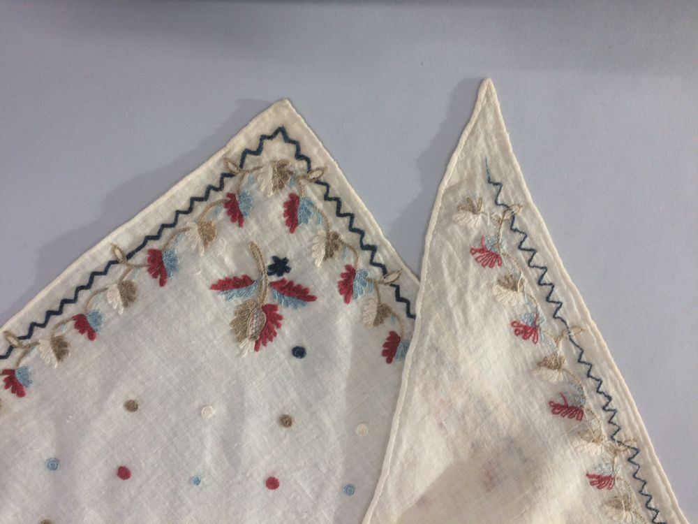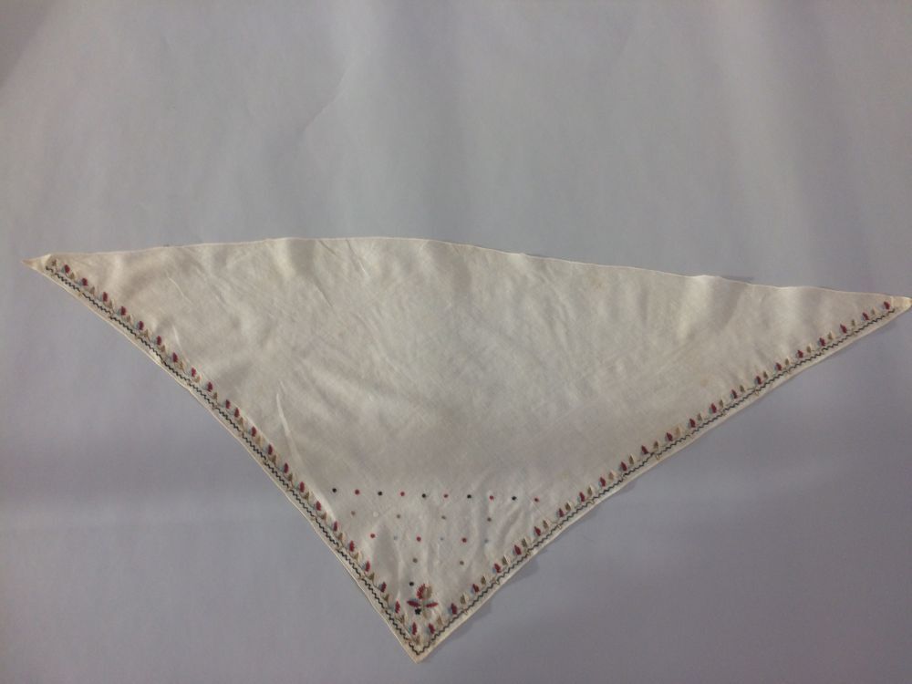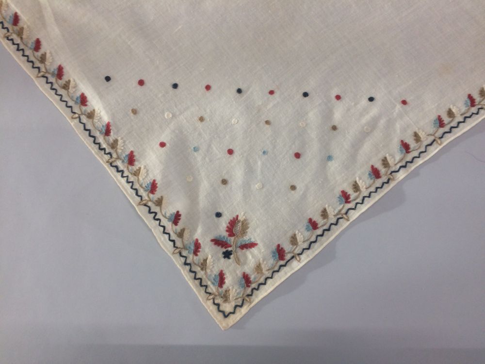 Fichu van dun wit katoen, versierd met tamboereerwerk met smalle bladrank en stippen in de punt