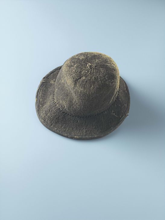 Hoed van Ameland met rand, zgn. flakje, van zwart dik vervilt breiwerk, met fluwelen binnenrand