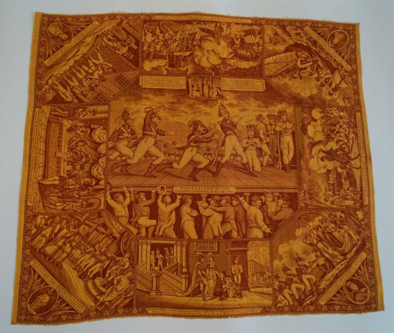 Bedrukte katoenen gedenkdoek in rood en geel van de Napoleontische tijd