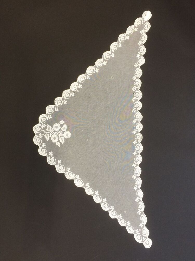 Fichu van tule versierd met tuledoorstopwerk, rondom geschulpt, met bloem in elke schulp