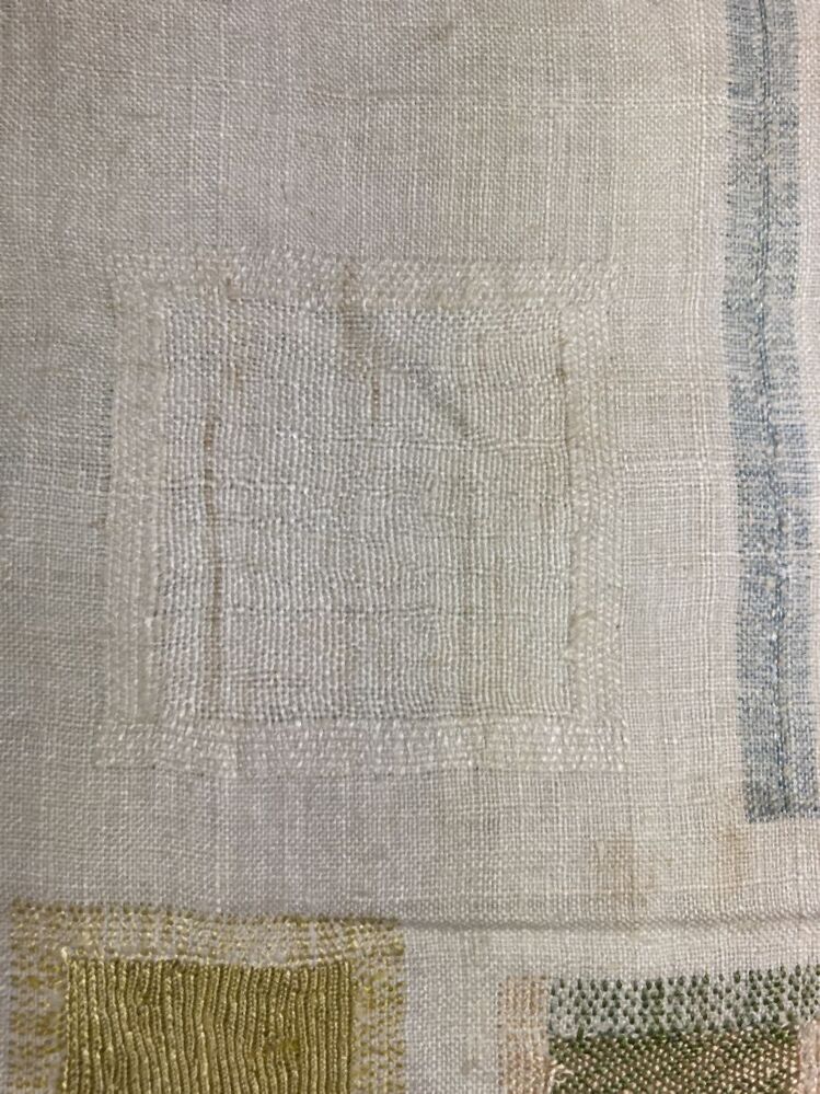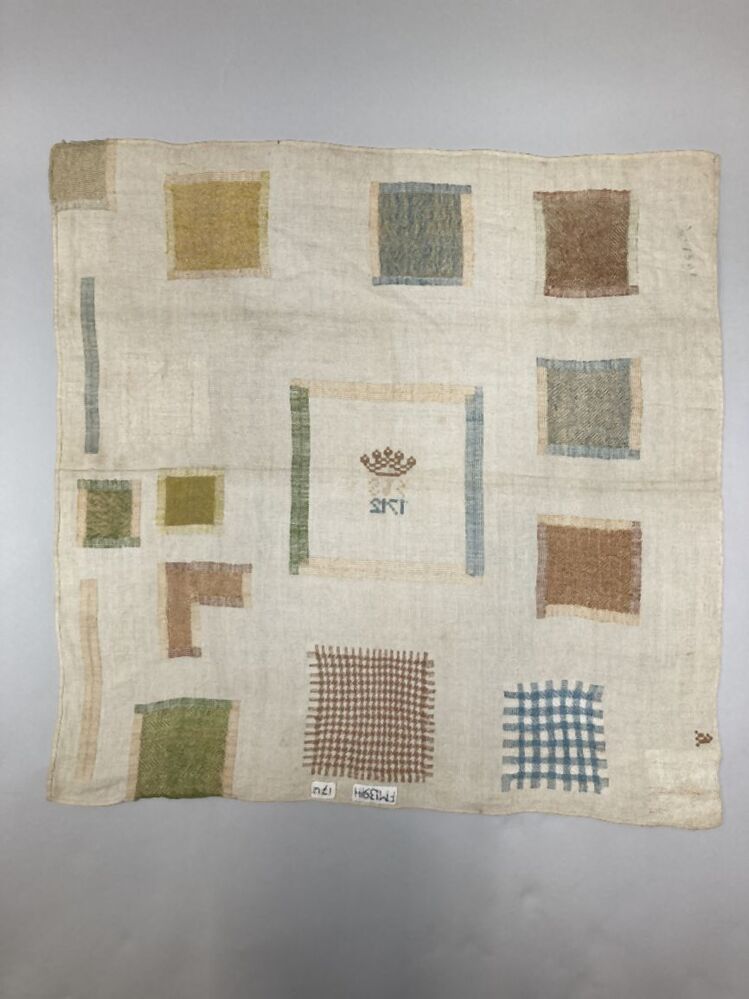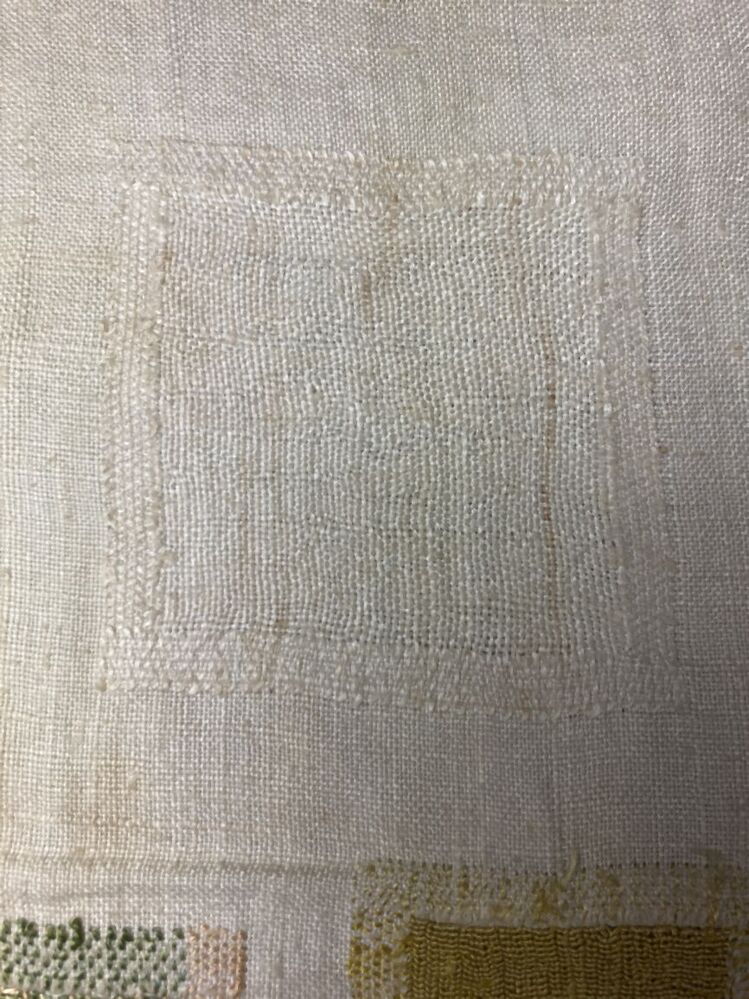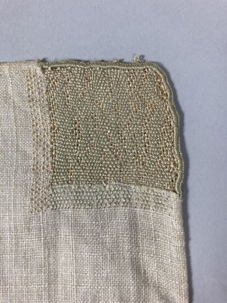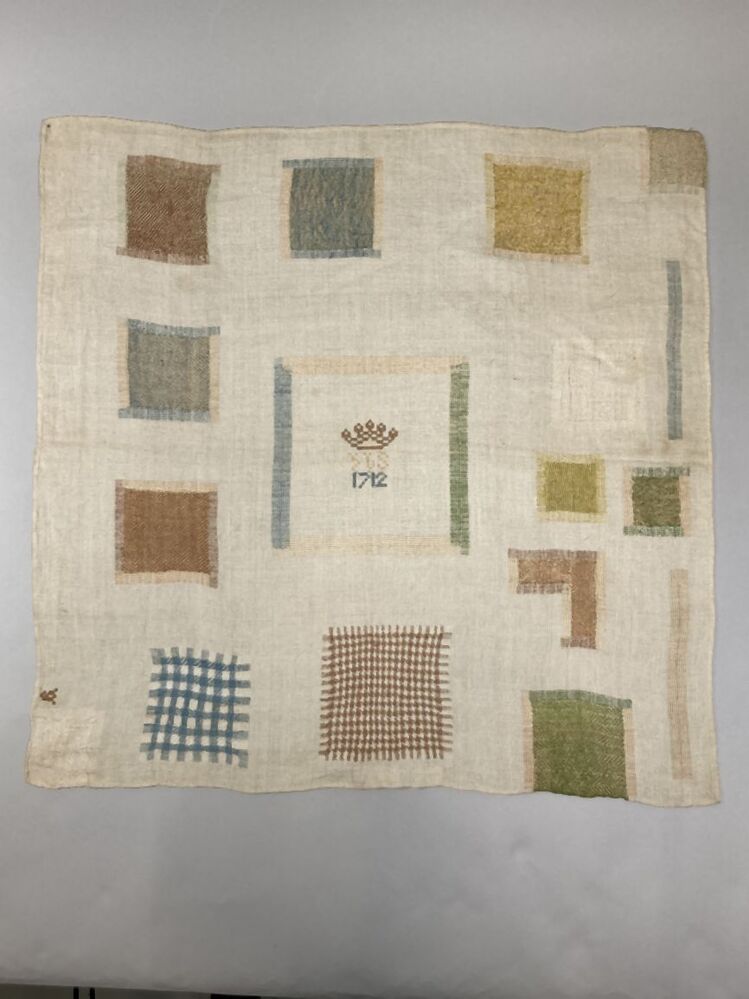 Stoplap van linnen, met zestien stoppen, met rijgsteken in beige, groen en lichtblauwgemerkt HBS, 1712