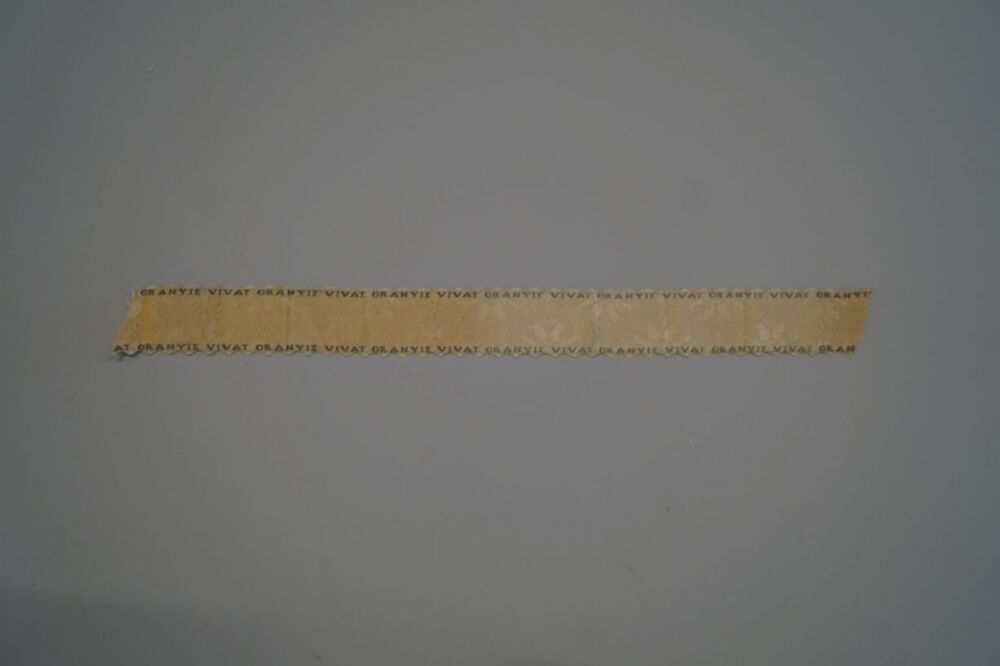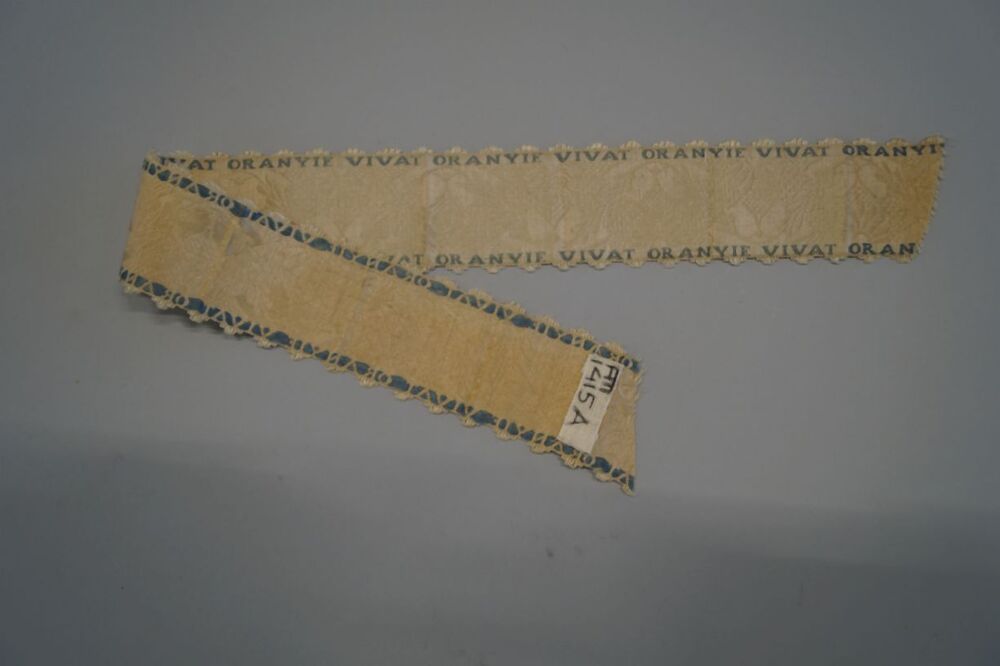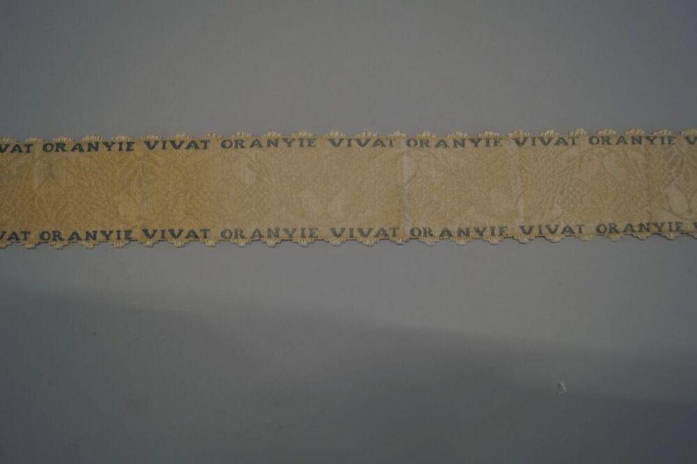 Oranjelint van zijde kettingribs met herhalende inscriptie: VIVAT ORANYIE