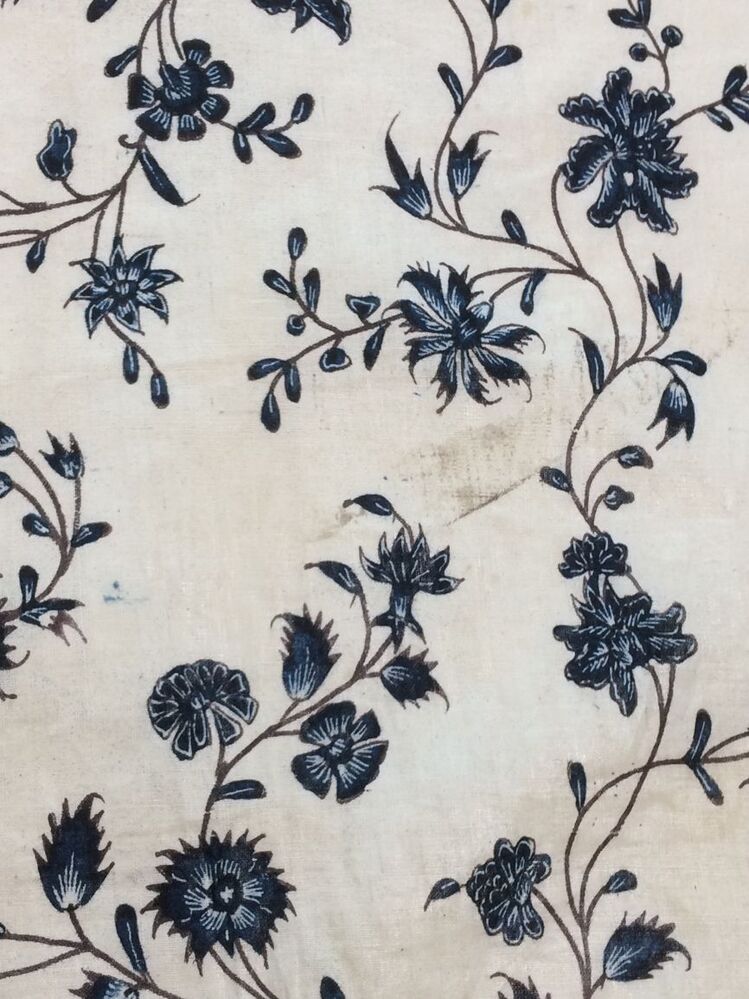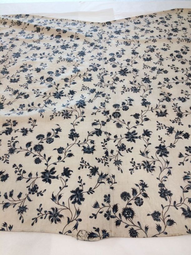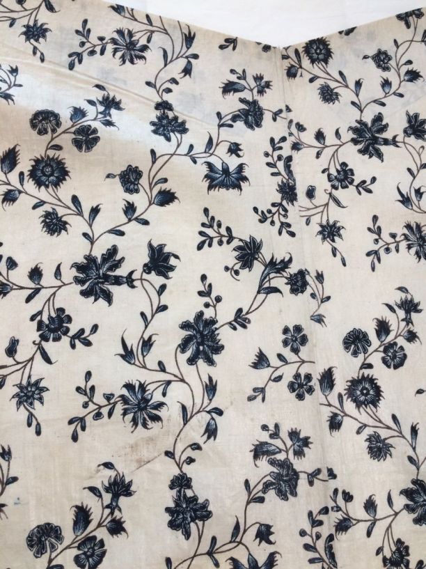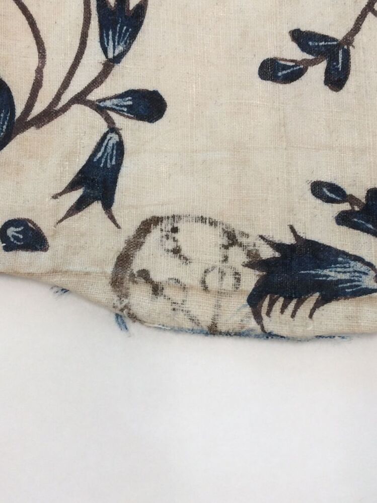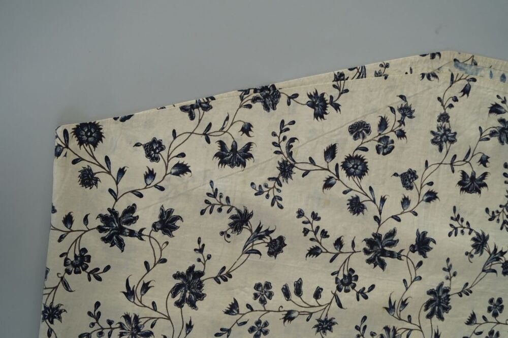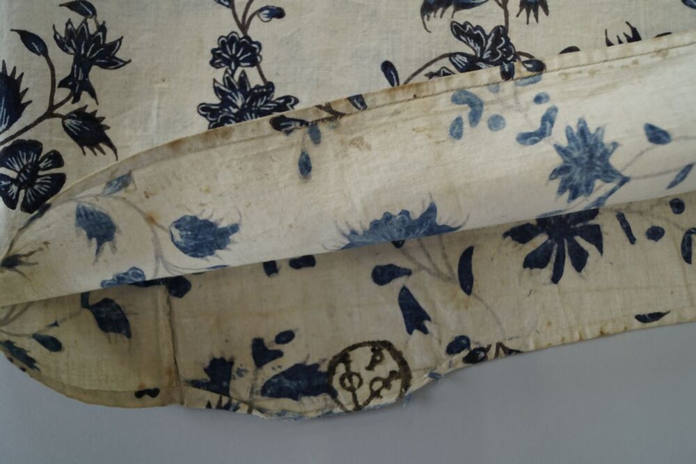 Schort van sits met blauwe bloemranken op witte grond, met VOC stempel in de zoom