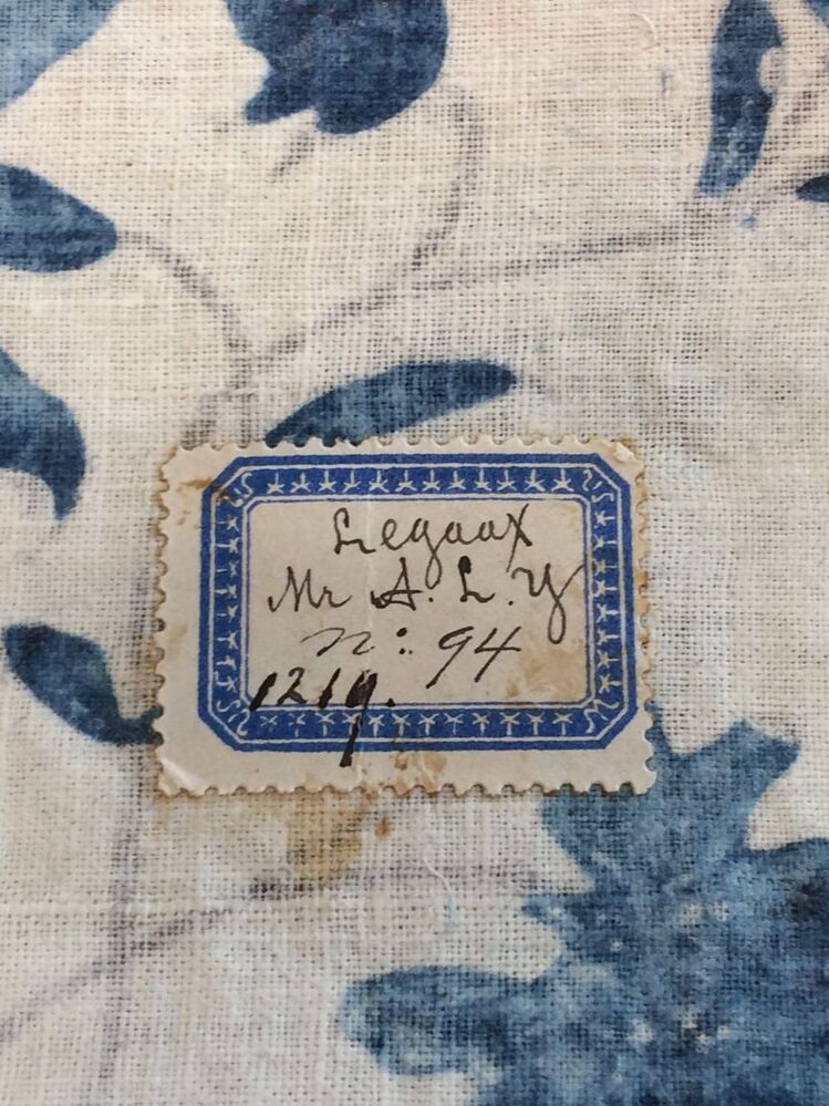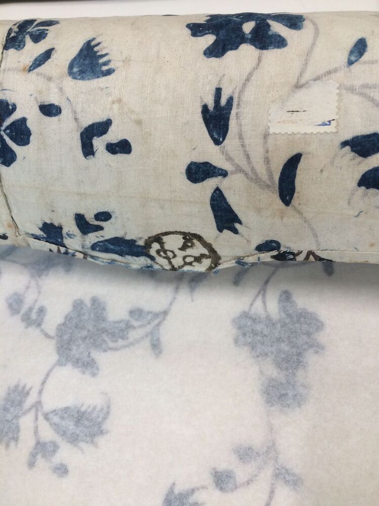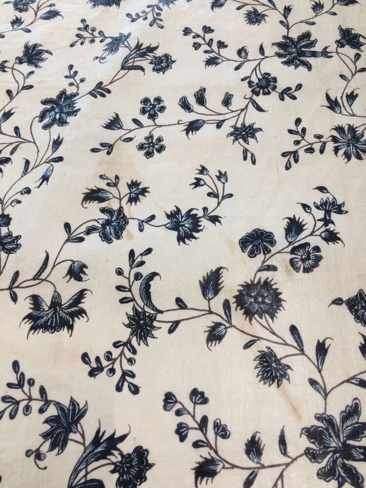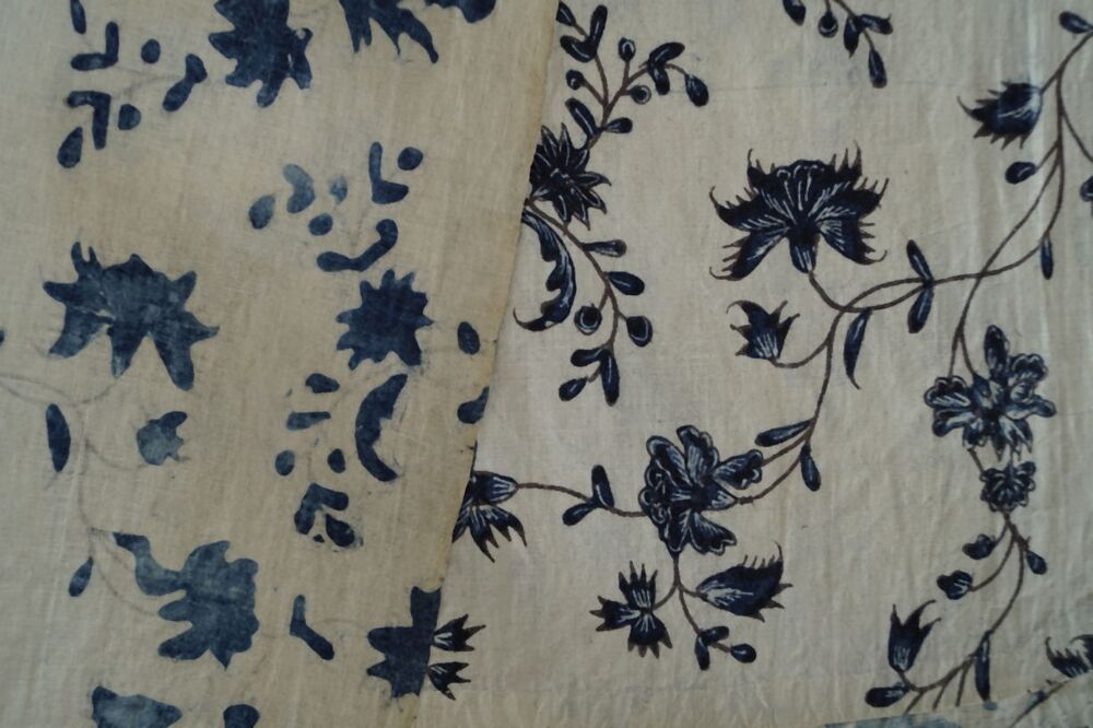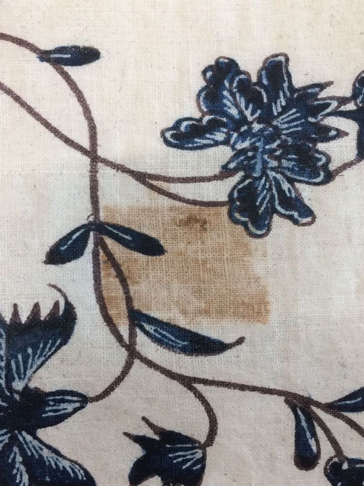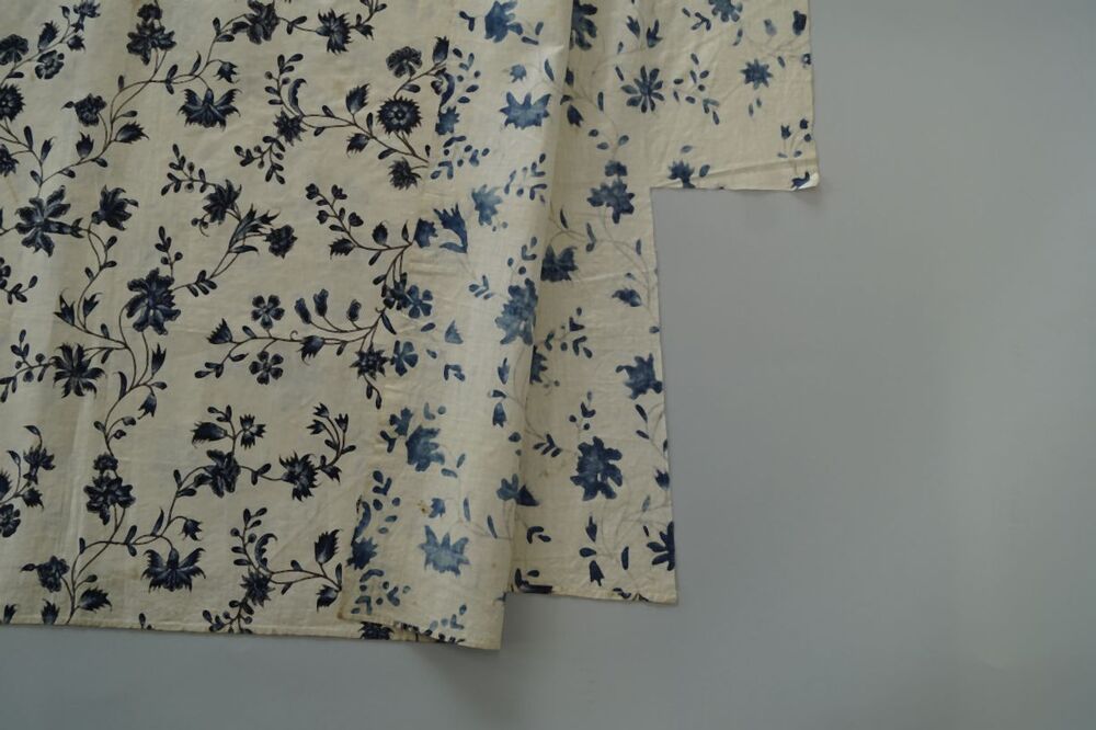 Schort van sits met blauwe bloemranken op witte grond, met VOC stempel in de zoom