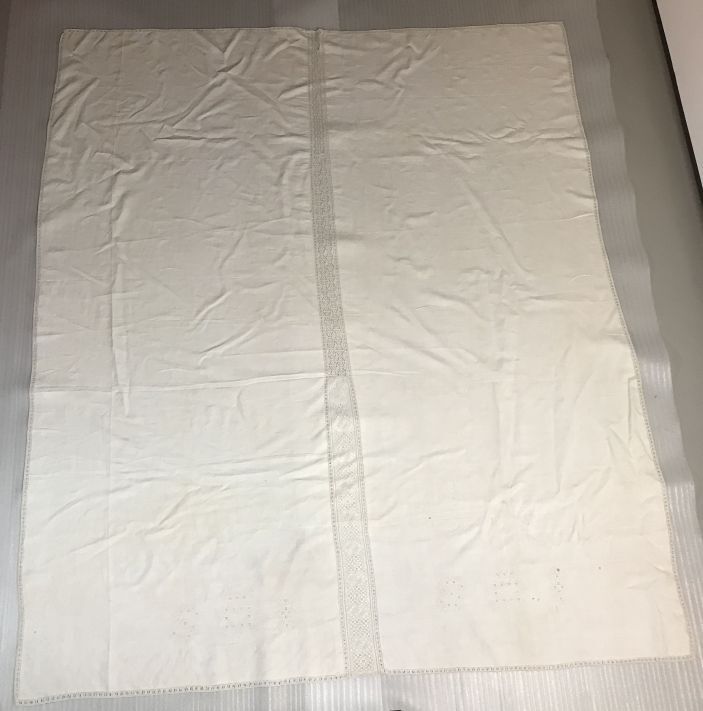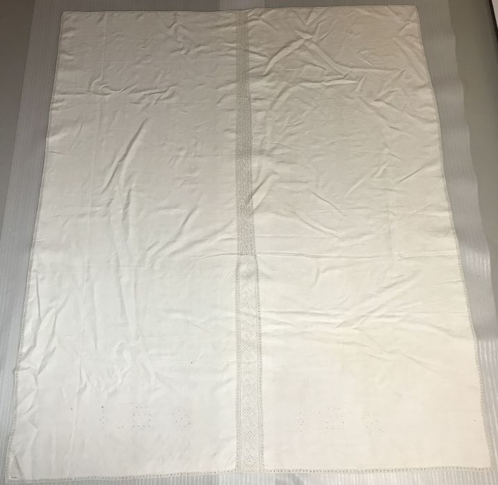 Linnen pronklaken met witwerk en sneewerk, initialen SI, met gekroond hart