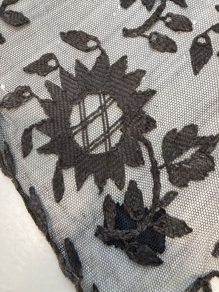 Tipdoekvormige kraag met zonnebloemen in de rand in zwart tuleborduurwerk