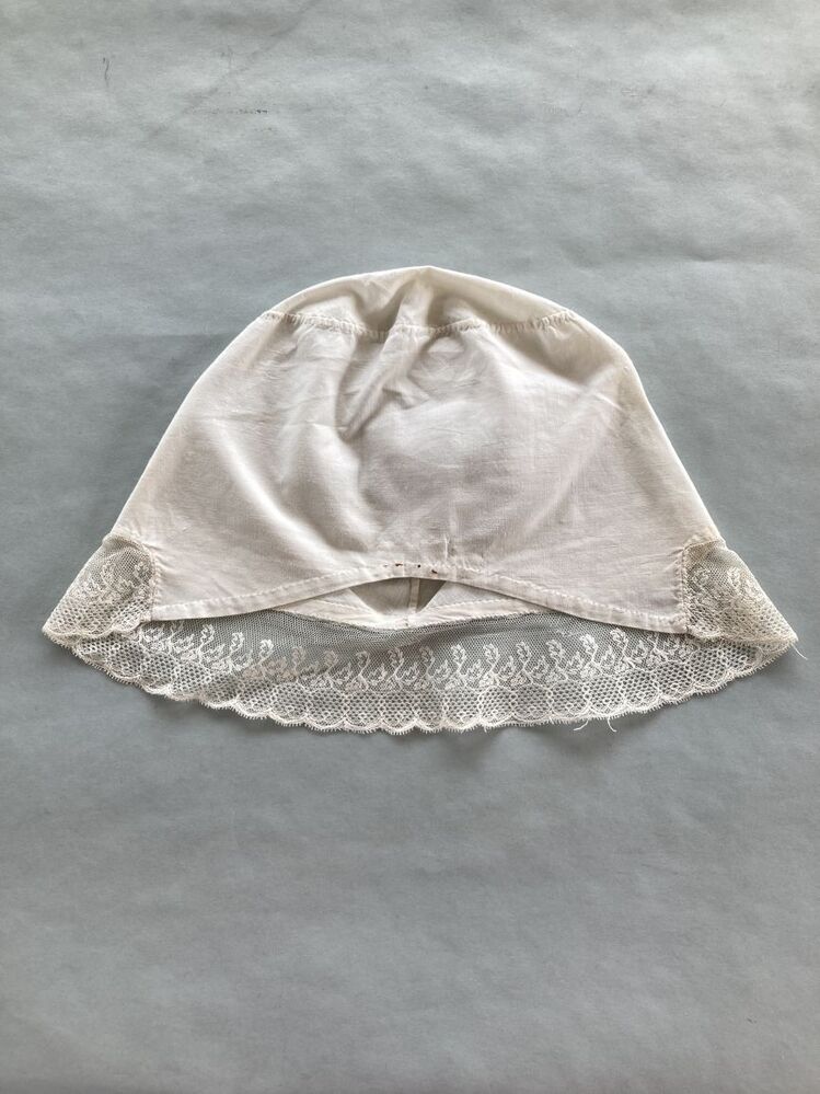 Witte ondermuts of tipmuts van katoen met ronde bol en achterstrook van fijne tule met doorstopwerk