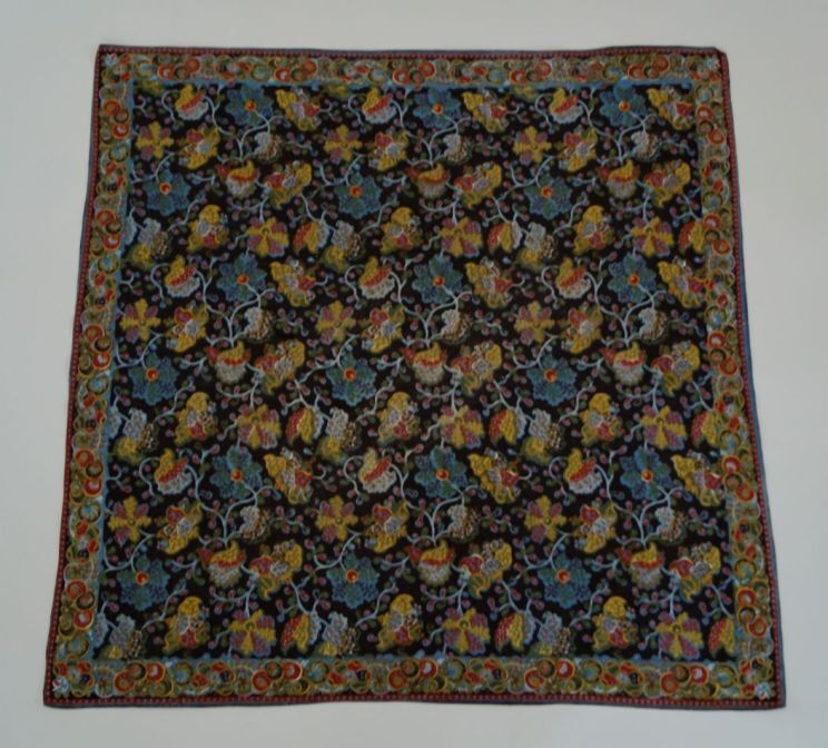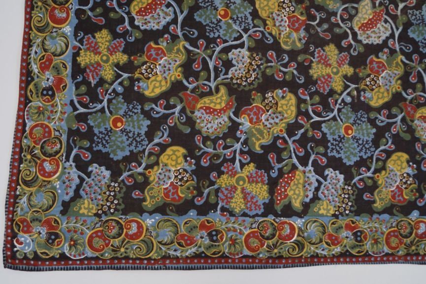 Vierkante, bedrukte katoenen doek met zeer druk fantasie-floraal patroon van exotische bloemen op zwarte grond