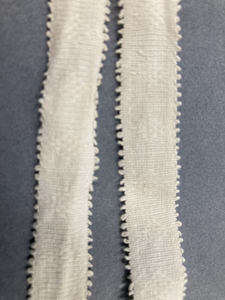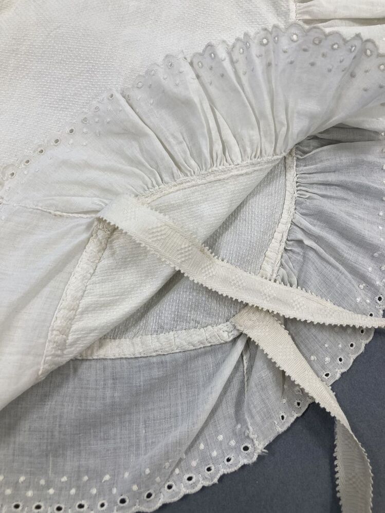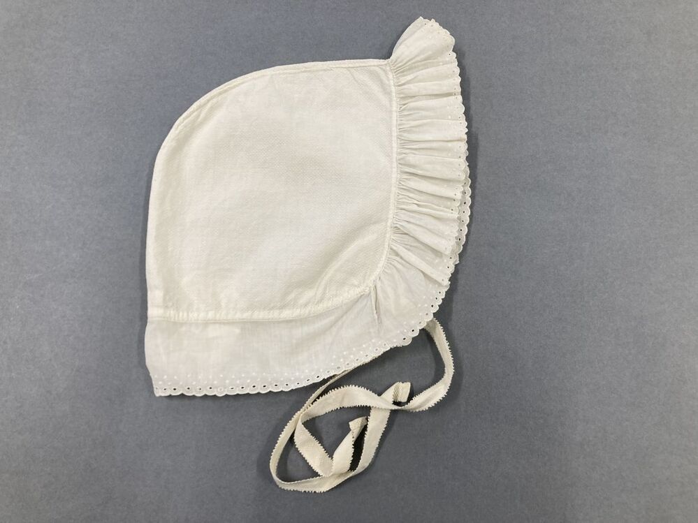 Muts van wit linnen met bandjes, voor afgezet met geborduurde strook, één van twee mutsen