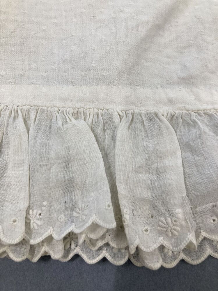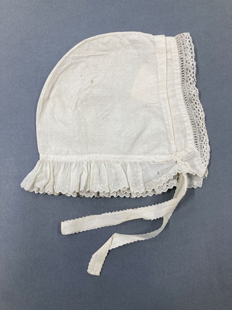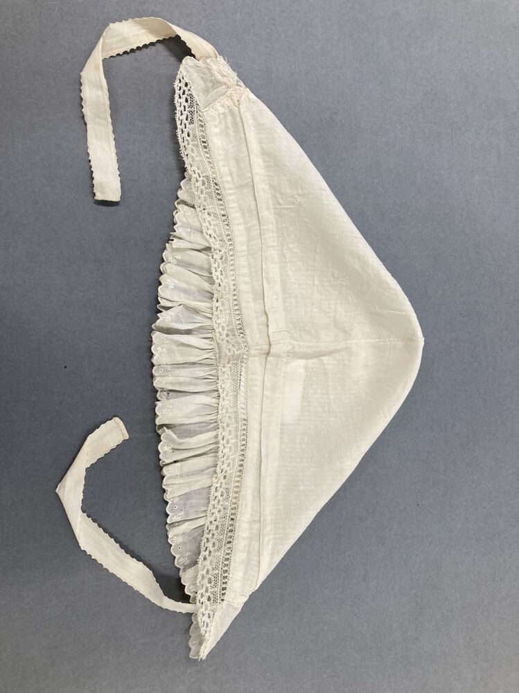 Muts van wit katoen met bandjes, voor afgezet met geborduurde strook, één van twee mutsen