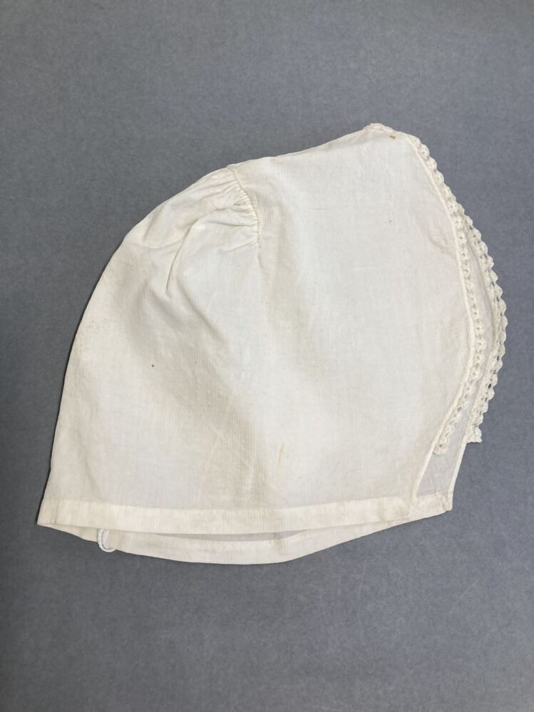 cornetmuts van wit gestreept katoen afgezet met gehaakt kantje