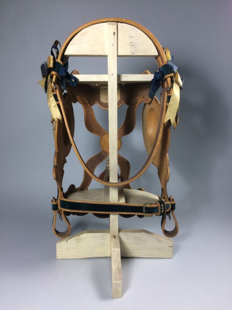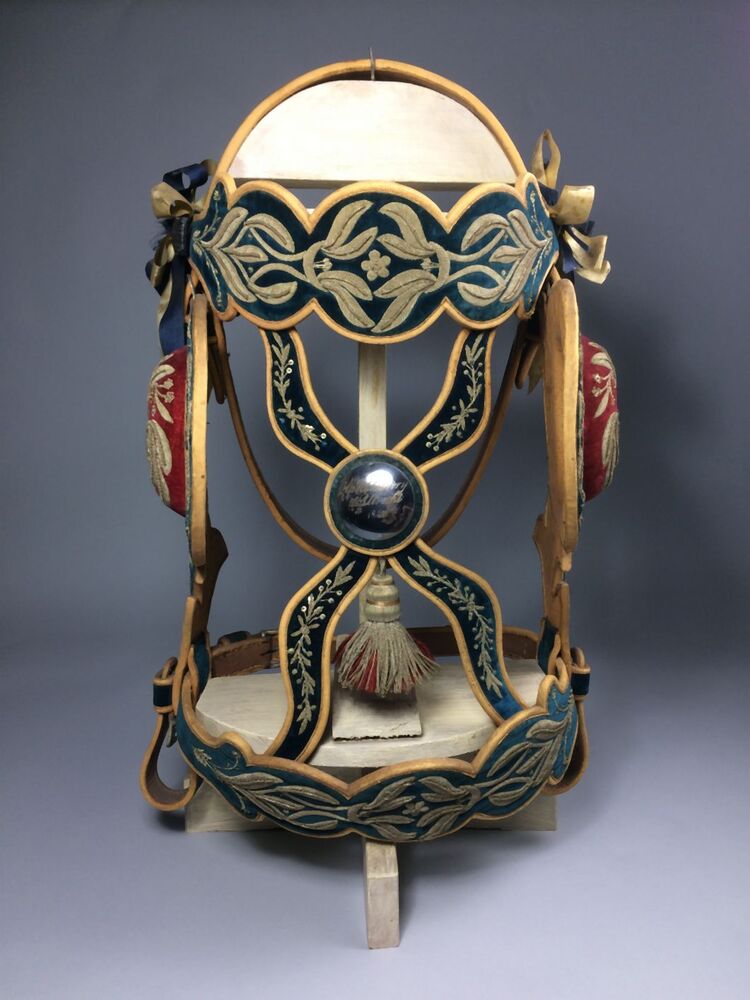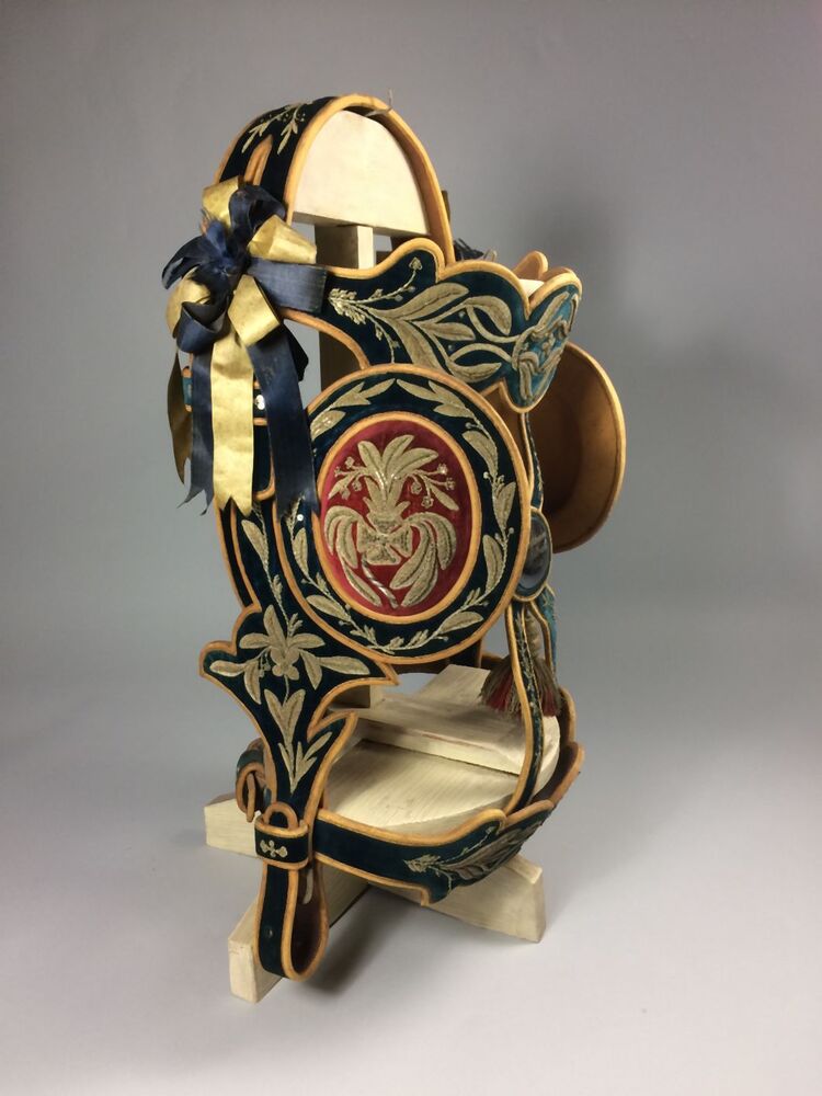 Eén van twee geel lederen paardenhoofdstellen met geborduurde bloem-en bladranken van zilverdraad op blauw fond