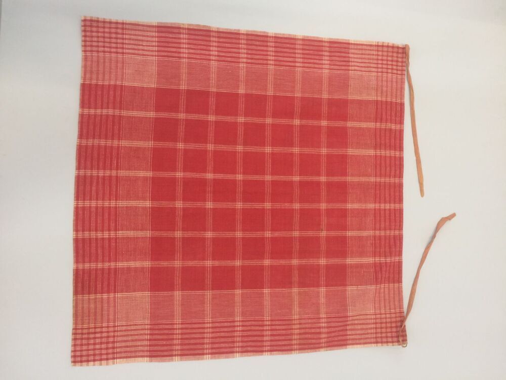 skerteldook of schort gemaakt van een halsdoek van bont, rood-wit met,ingeweven rand rondom