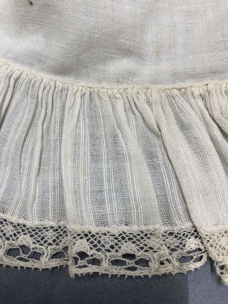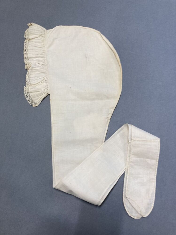 Slaapmuts van wit linnen met strook gestreept linnen langs het gezicht