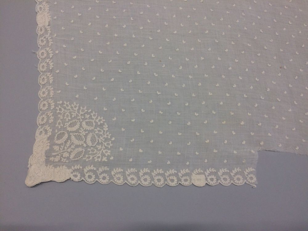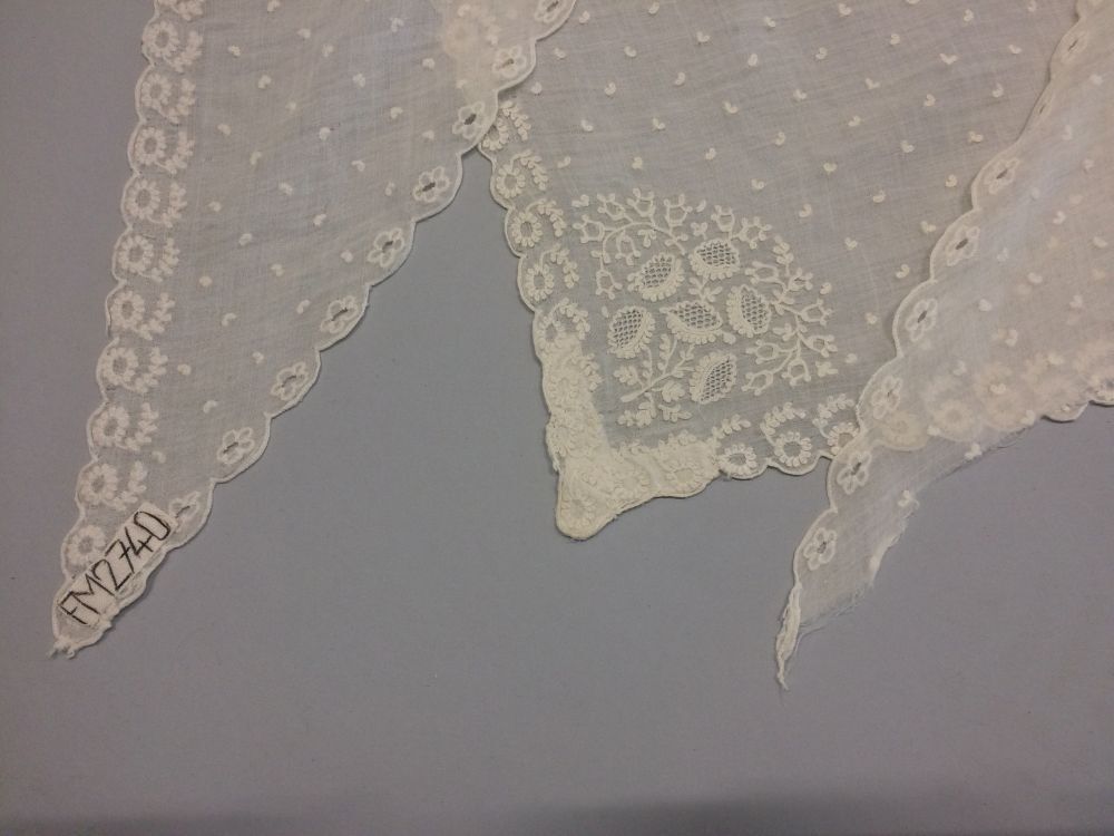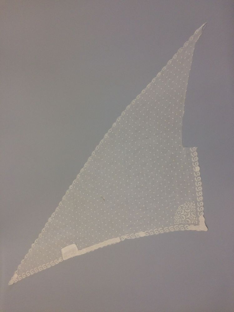 Witte dunne katoenen fichu met aan alle drie zijden een afgewerkte schulprand