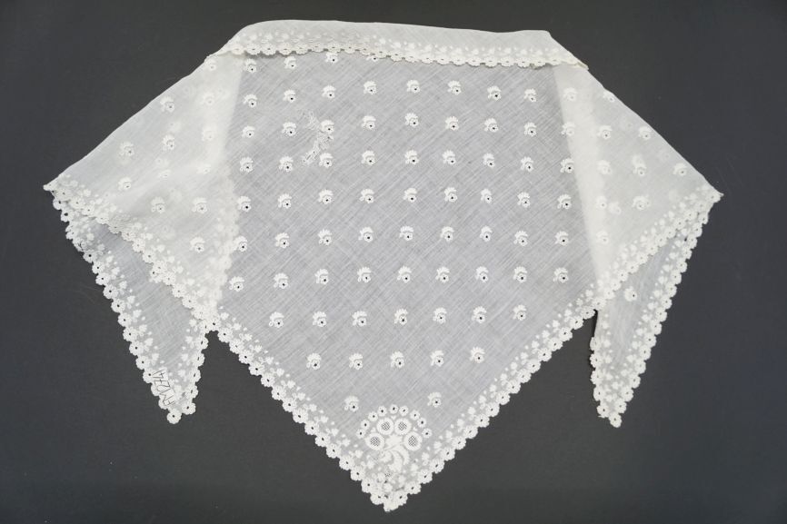 1) hals- of hoofddoek die met een tip (uiteinde) op de rug wordt vastgespeld. https://data.cultureelerfgoed.nl/term/id/cht/00c8692f-af9f-490f-b4ec-ec045b417f30