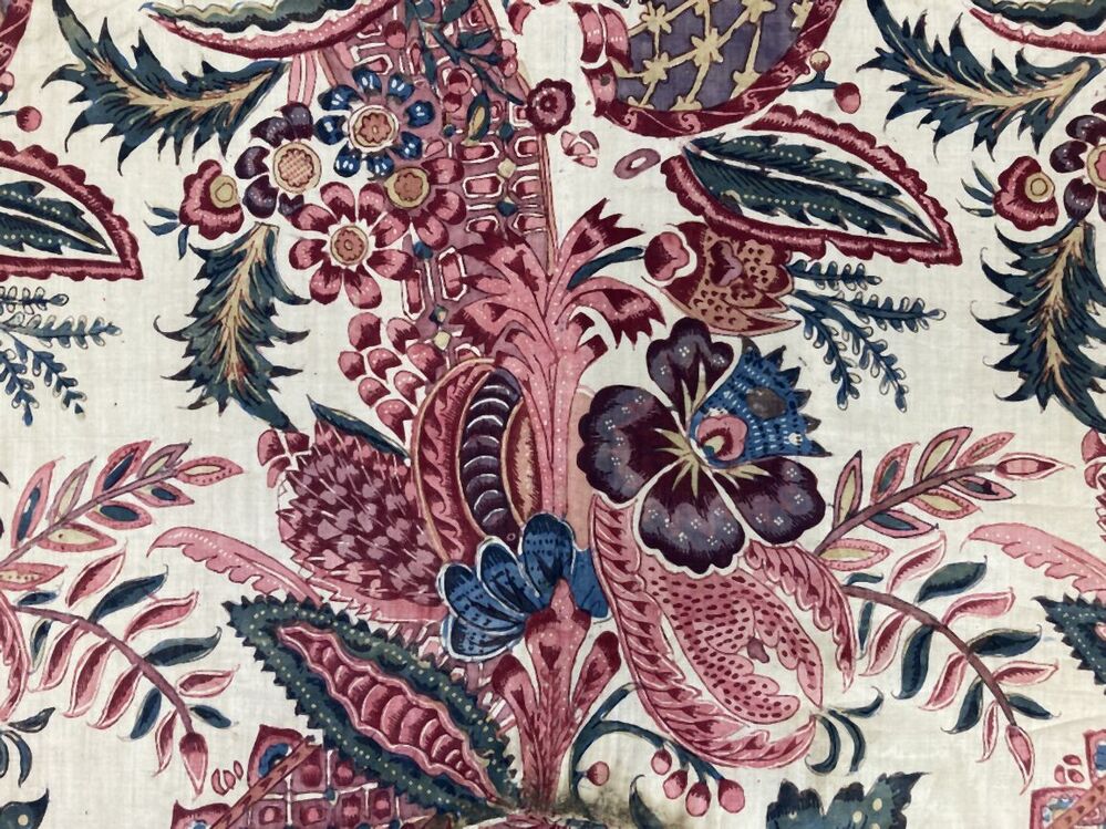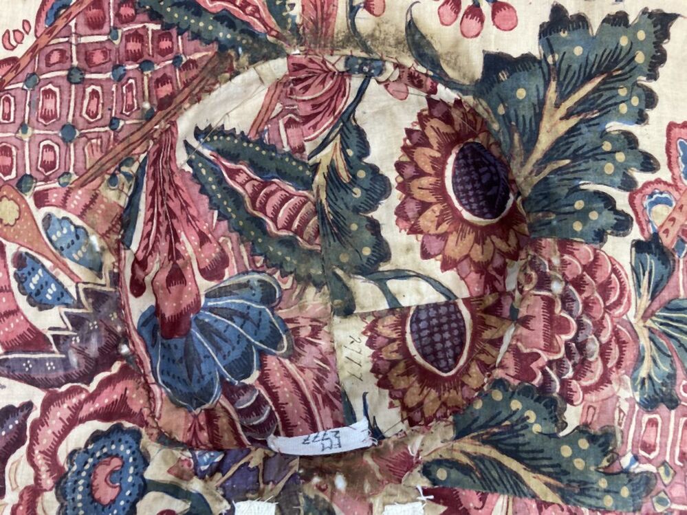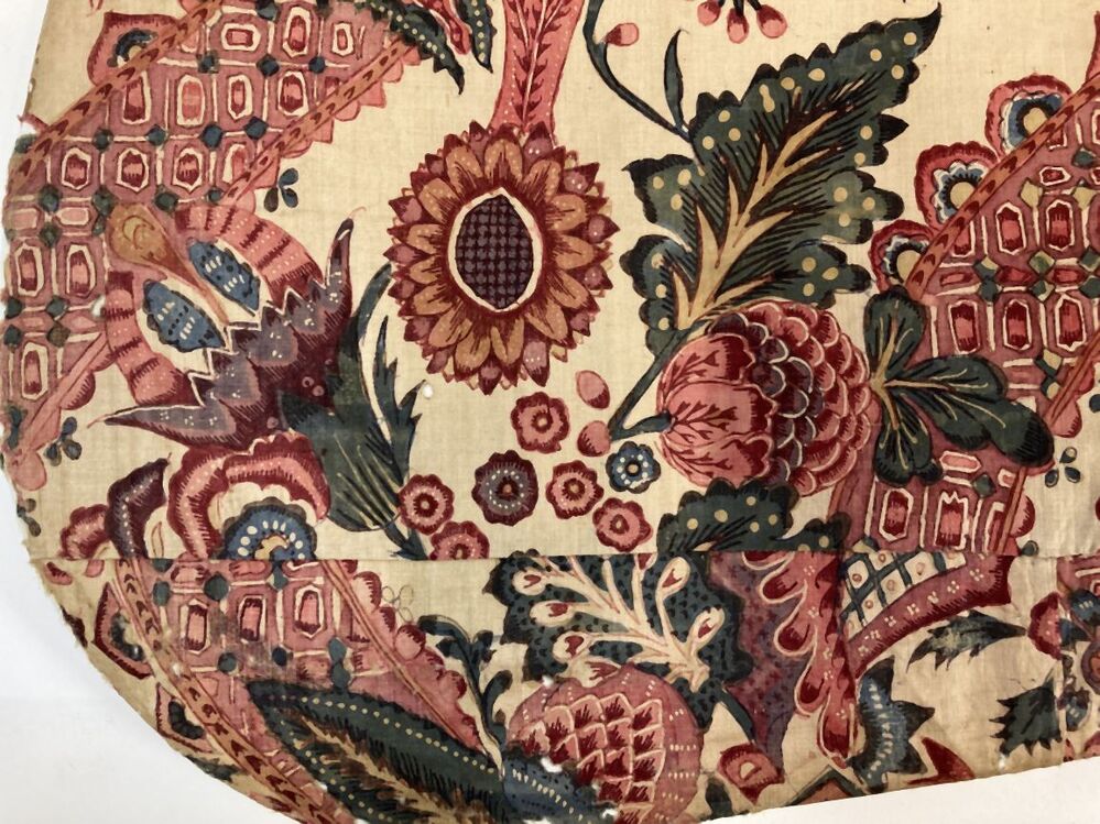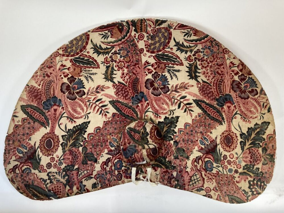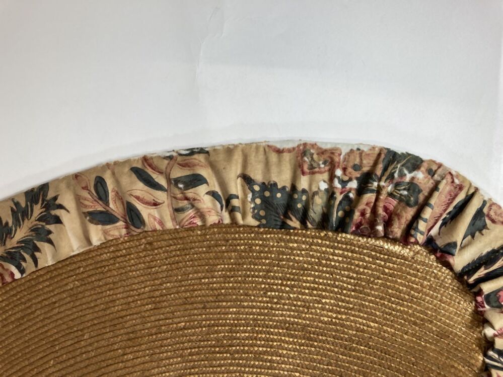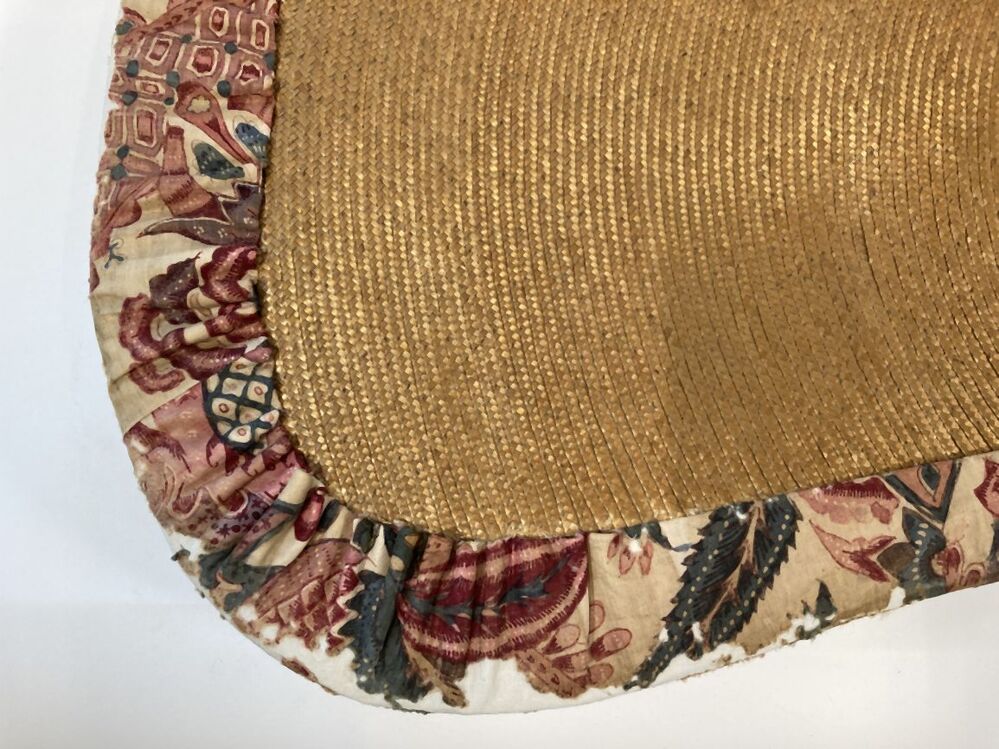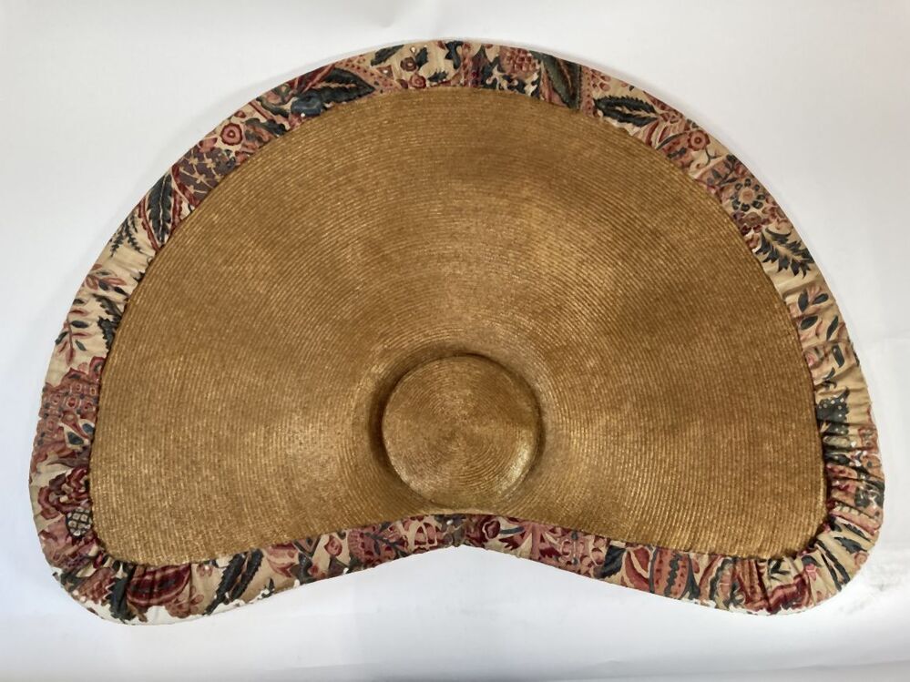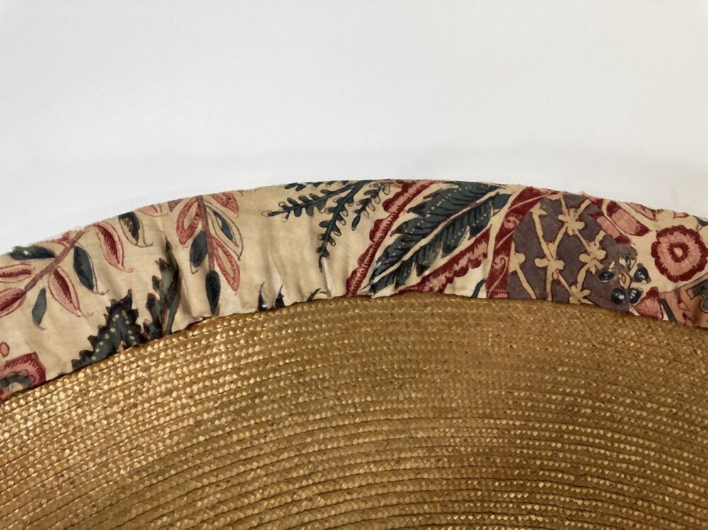 Zonhoed met sitsen voering, beschilderd met golvende banden en losstaande boeketten op witte grond