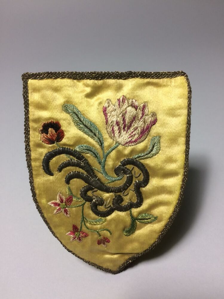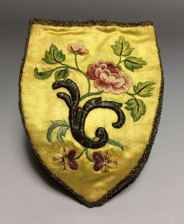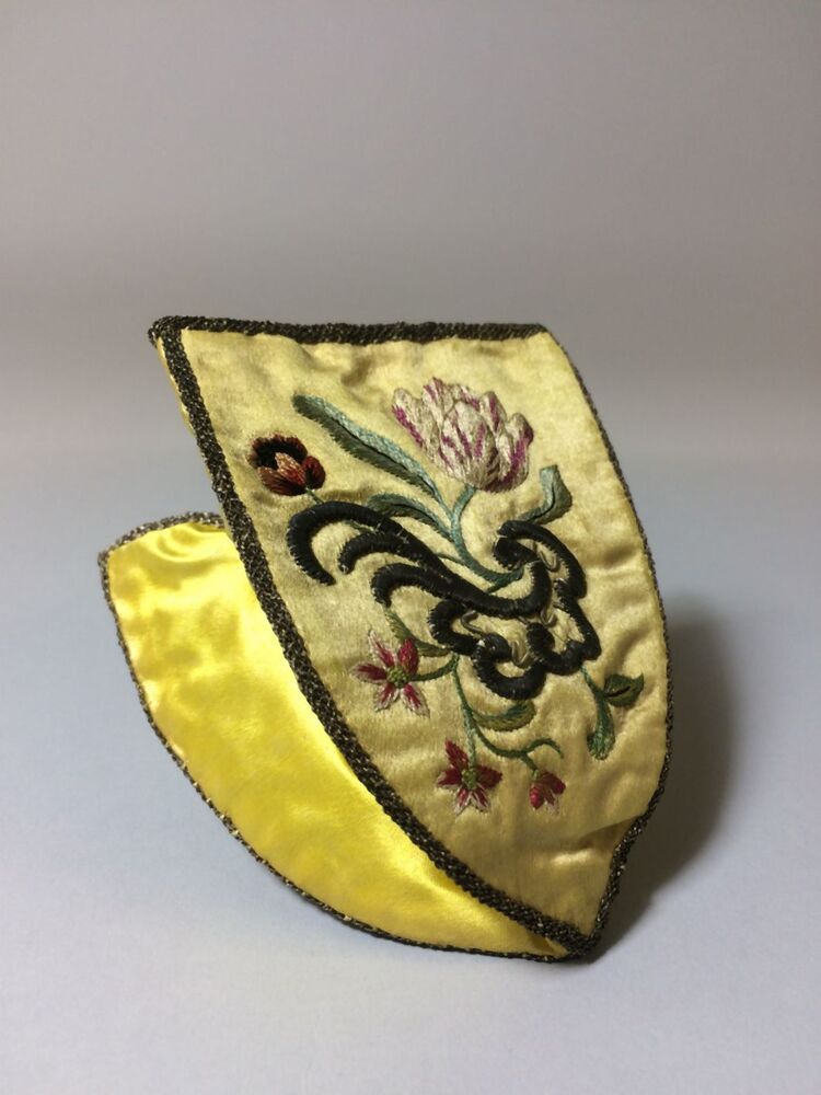 Beursje van gele zijde, geborduurd in ingrijpsteek en plumetis en zilverborduursel