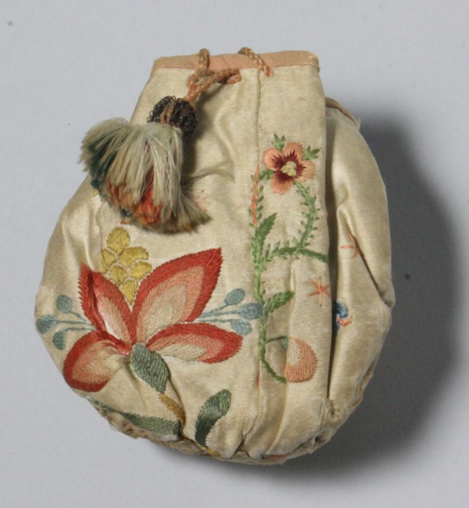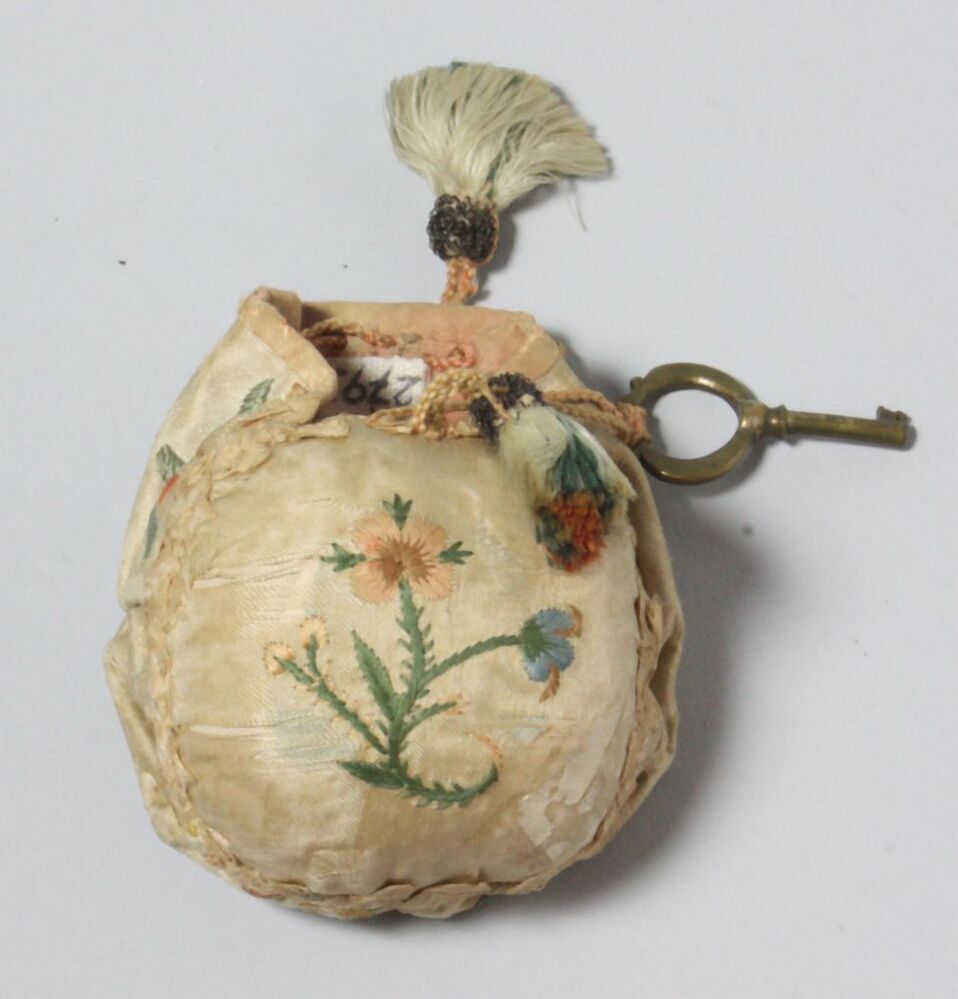 Speldenkussen waarvan de achterzijde aan een tasje is bevestigd, witte zijde afgezet met roze zijde