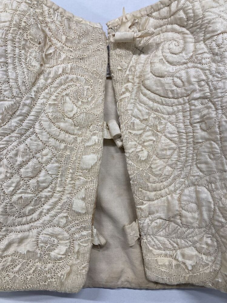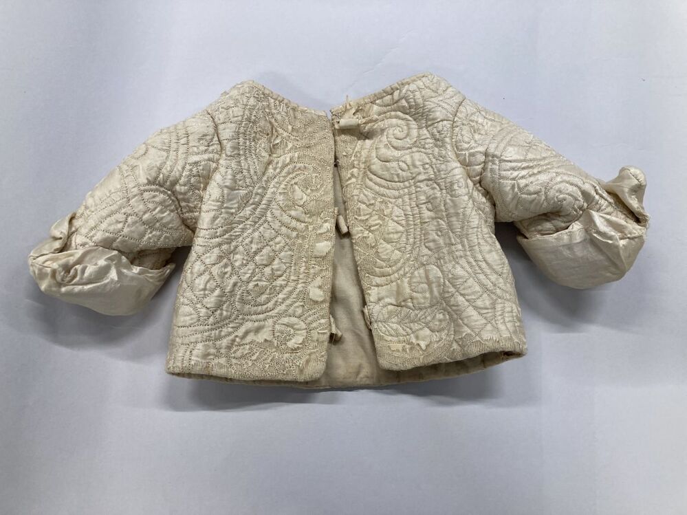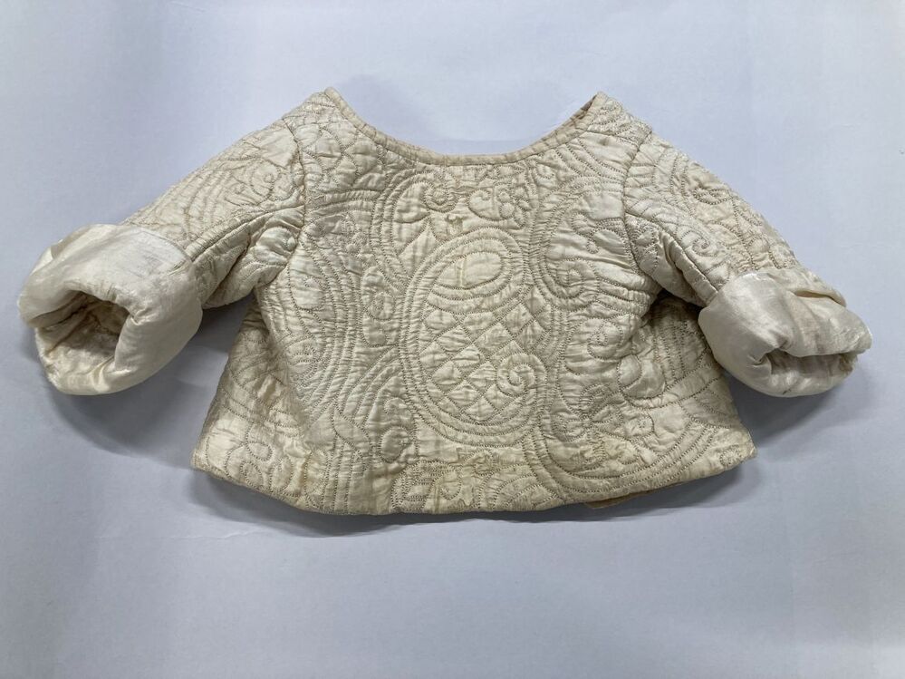 Jakje van crèmekleurige zijde met matelassé patroon, met tussenvoering van witte wollen stof