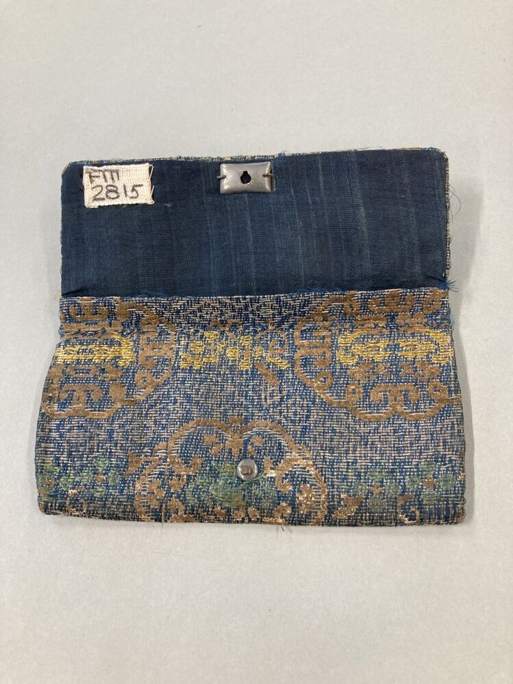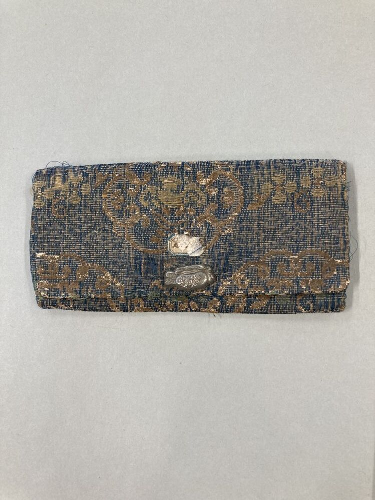 Tasje of portemonnaie van blauw stof met lange goudpapieren en zijden flotteringen
