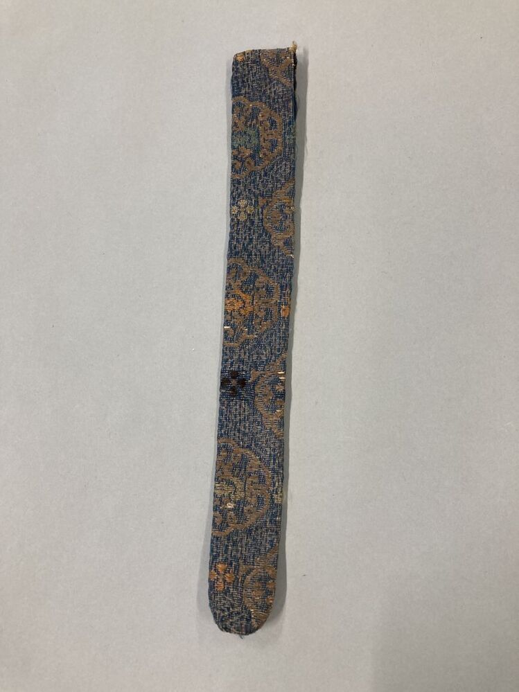 Foudraal voor haakpennen van blauwe, rode, gele zijde geborduurde stof met donkerblauwe voering