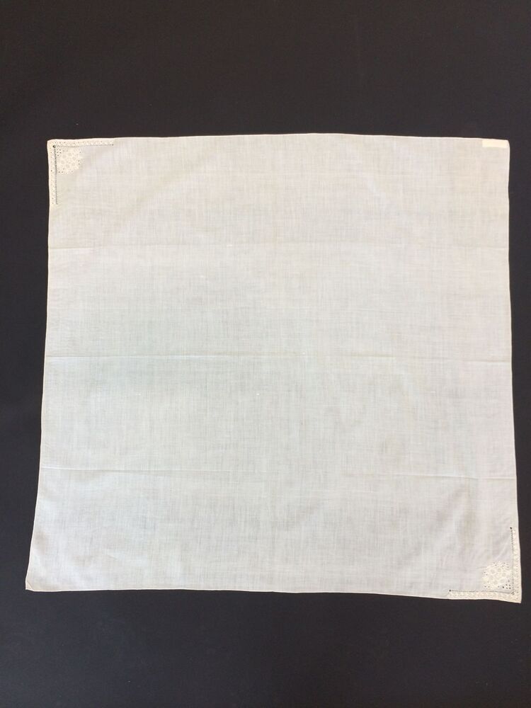 Vierkant halsdoekje van wit katoen, de twee tegenoverelkaar liggende hoeken met geborduurd floraal motief