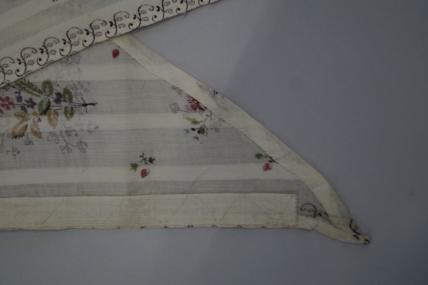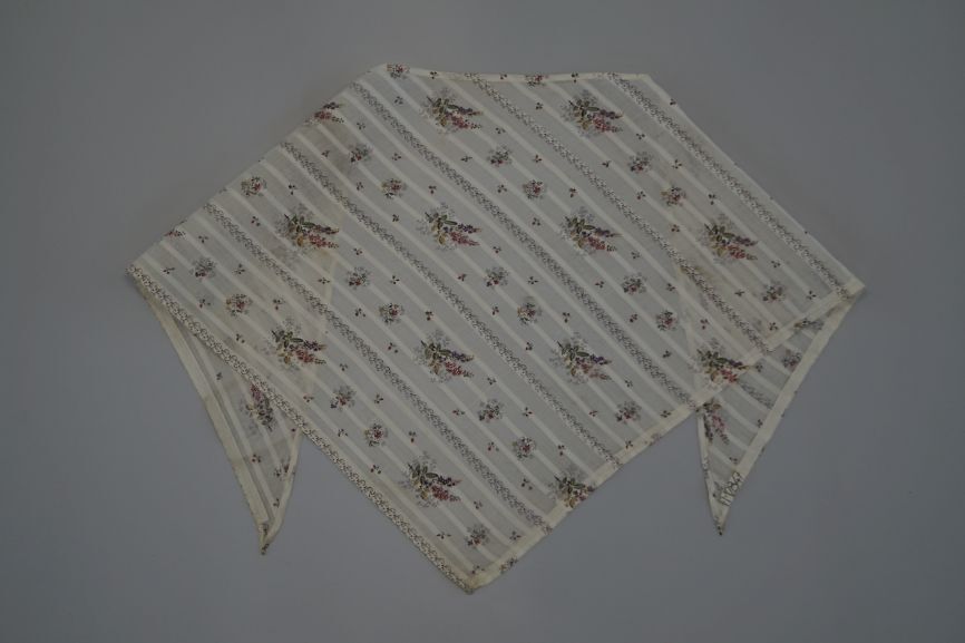 Driekante doek van transparant wit katoen met ingeweven strepen en bedrukt met boeketjes