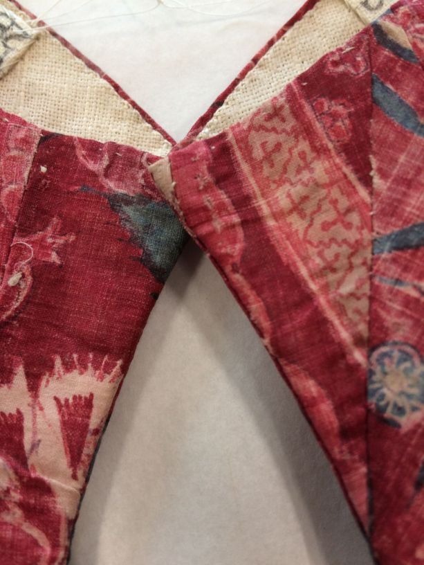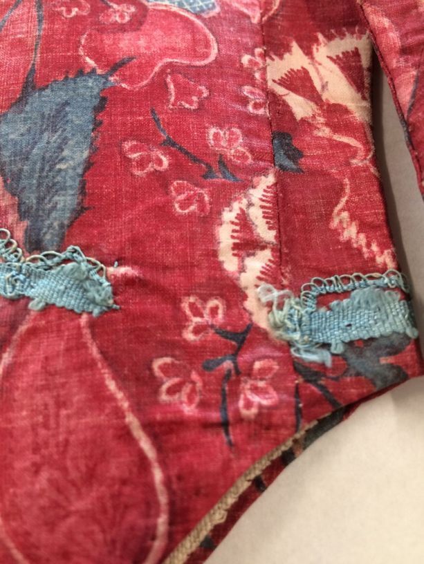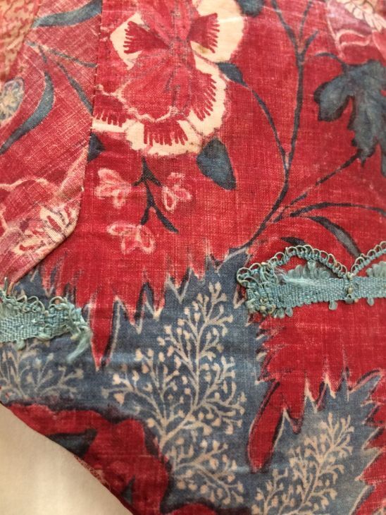 Sitsen kindermouwtjes, met naturalistische bloemen op rode grond, afgezet met lichtblauw zijden galon