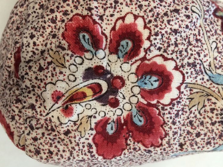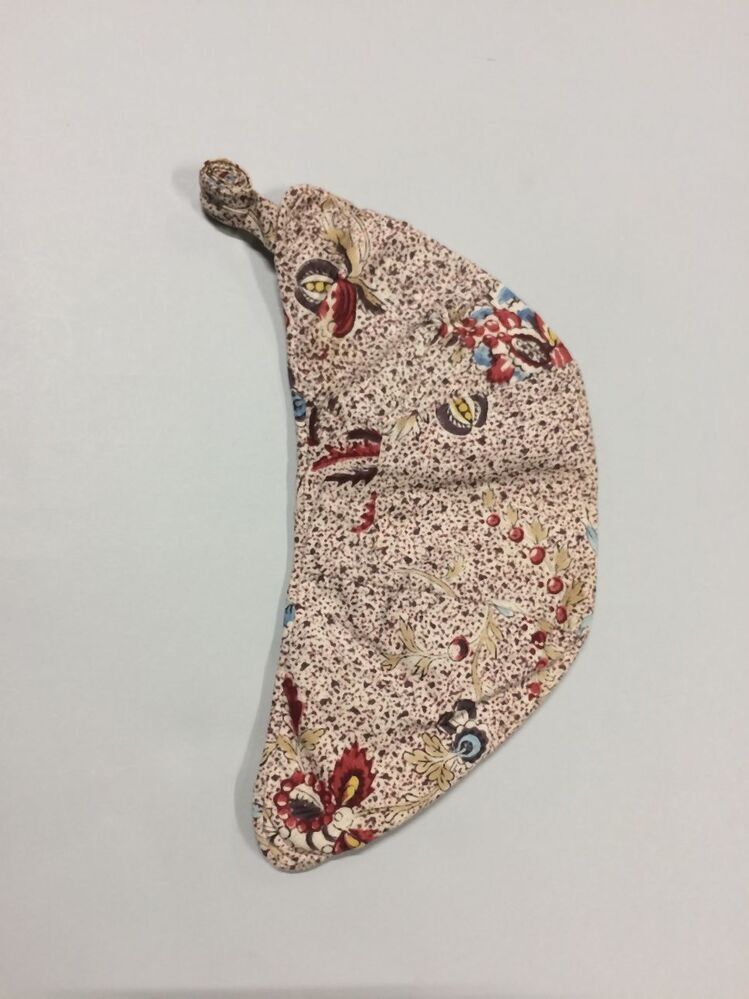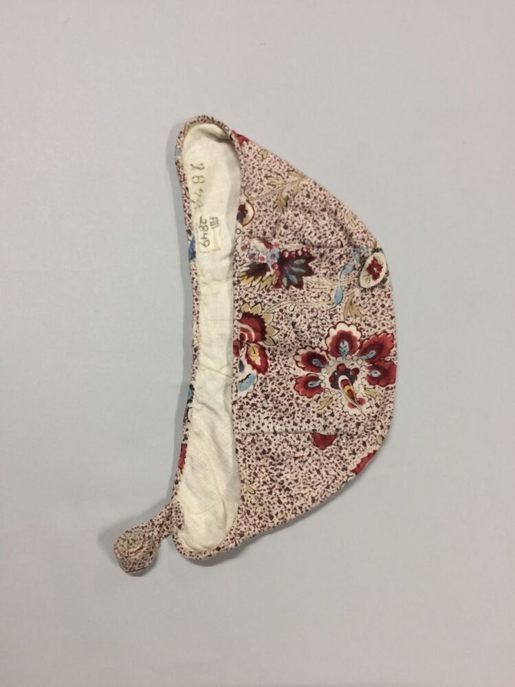 Meisjesmuts, fantasiebloemen op zwart-rood-paars gespatte witte grond