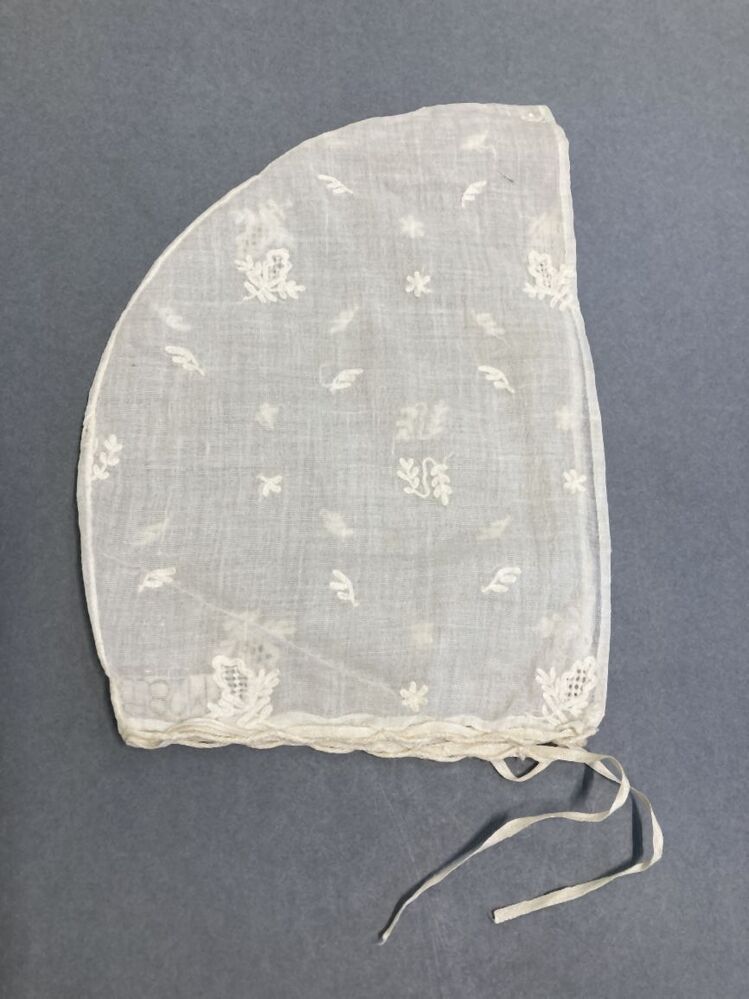 Vrouwenmutsbol van wit neteldoek met bloempjes getamboereerd