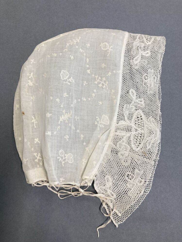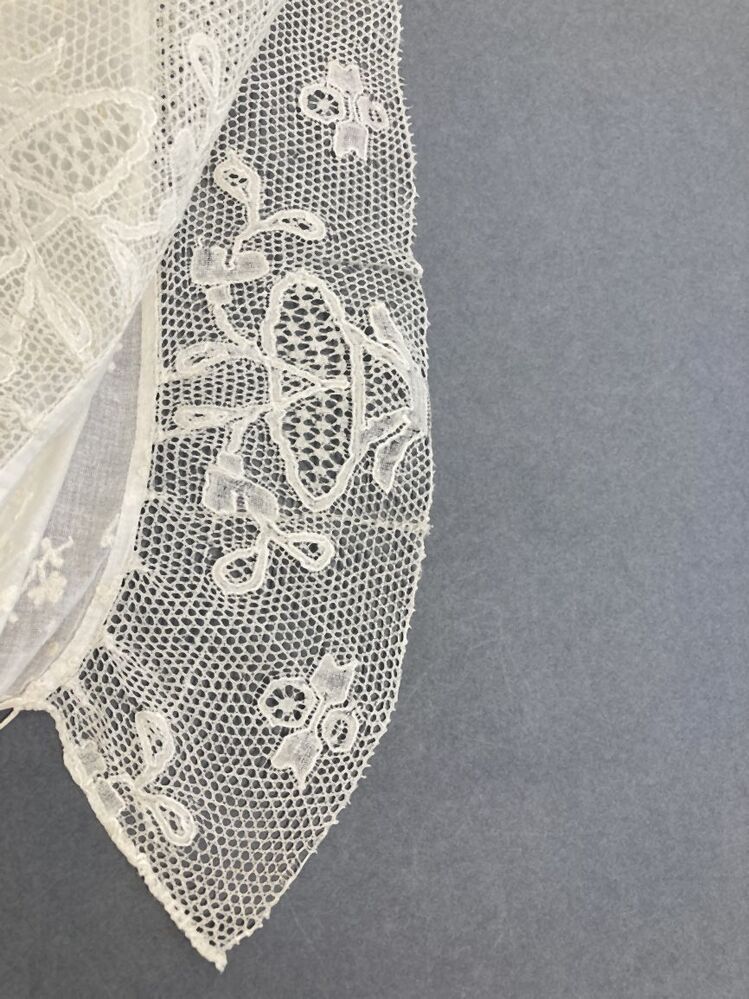 Vrouwenmuts, fijn linnen met getamboereerde bloempjes, afgezet met strook Antwerps pottenkant met point de paris grond